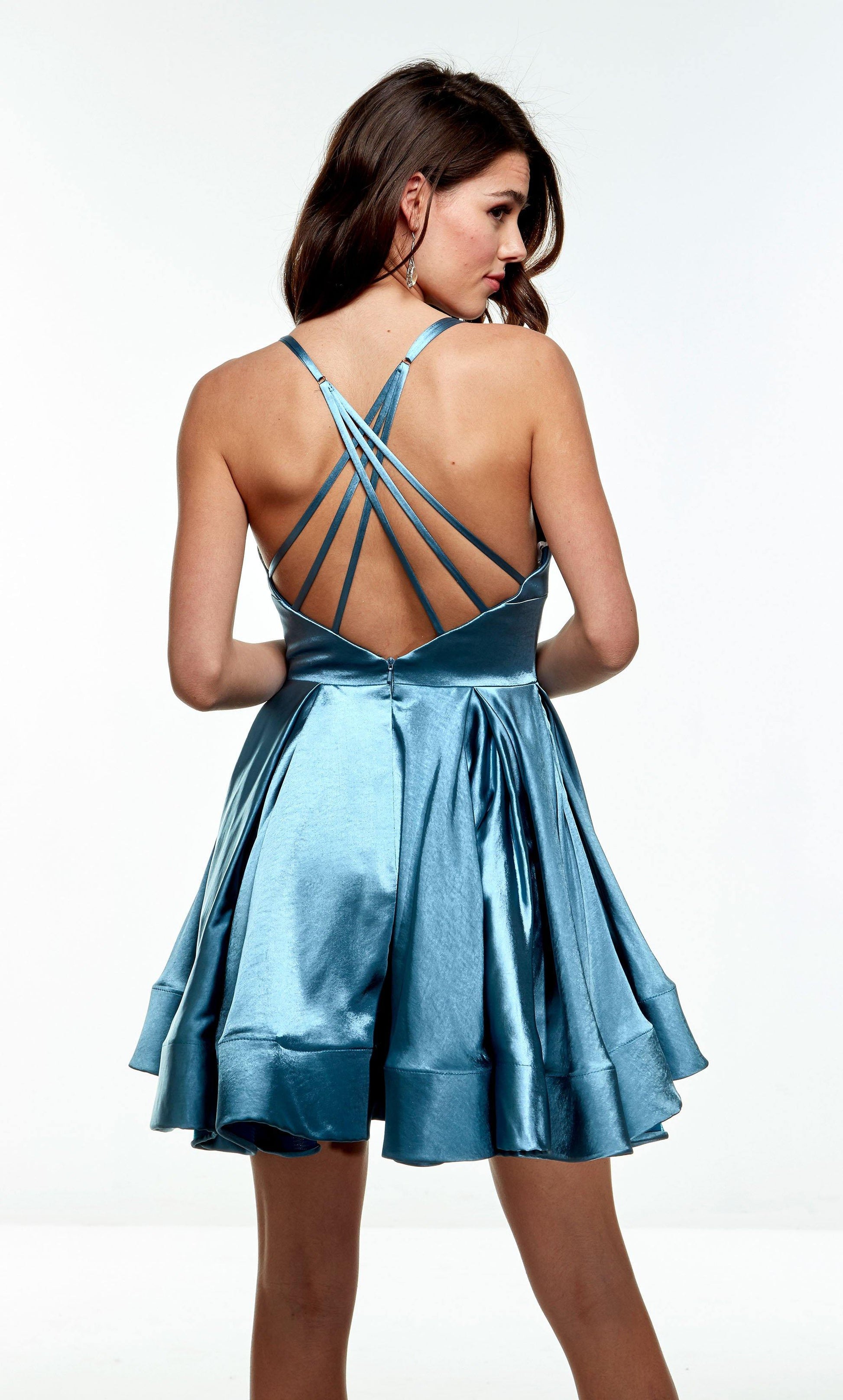 Alyce 1676 Short Party Dress, Washed Charmeuse, V-neck, A-line, Strappy Back, Pockets, Adjustable Strap.