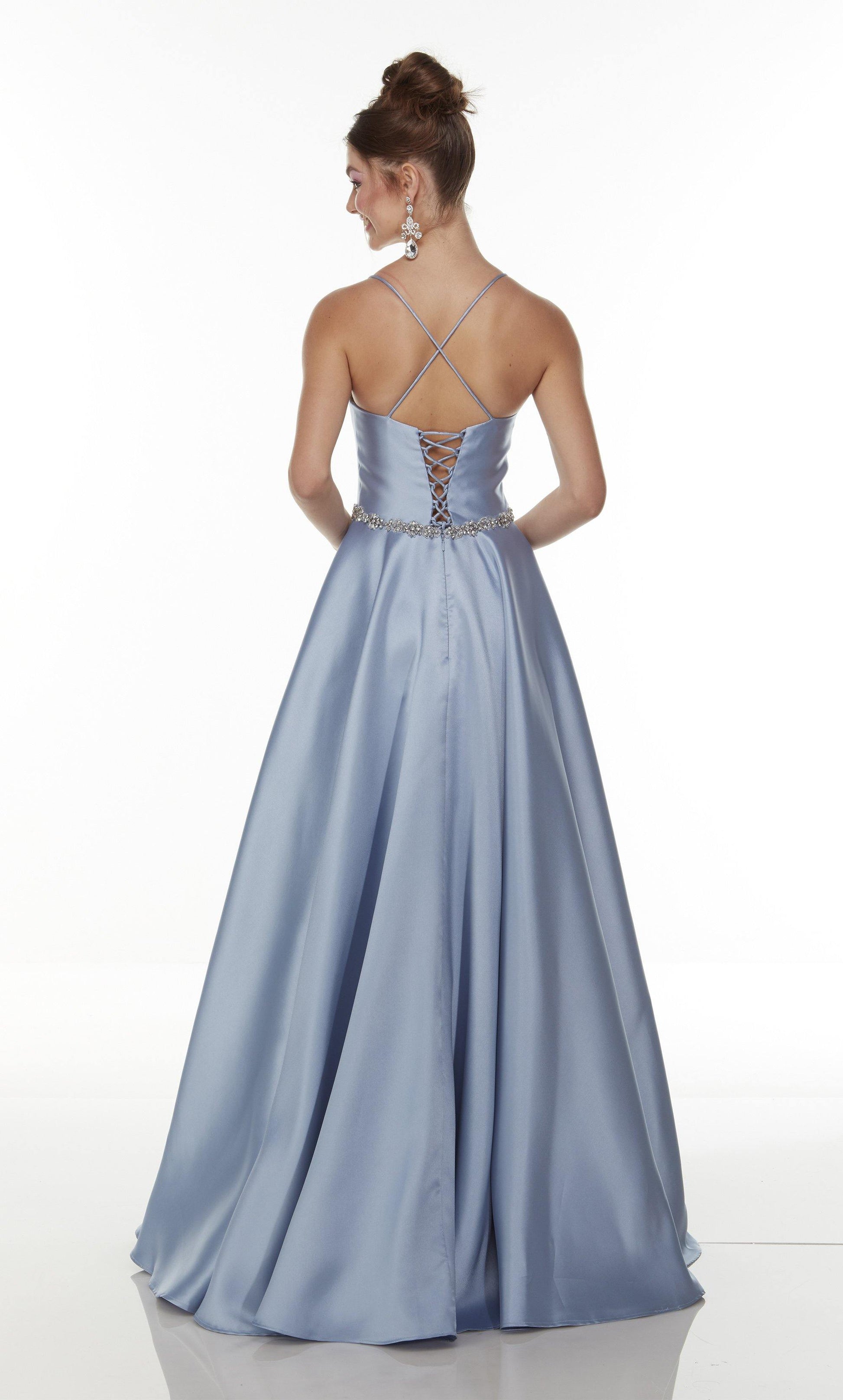 Alyce 1733 Long Evening Gowns, Mikado, Square Neckline, A-line, Lace Up Back, Jeweled Waist, Side Slit, Pockets.