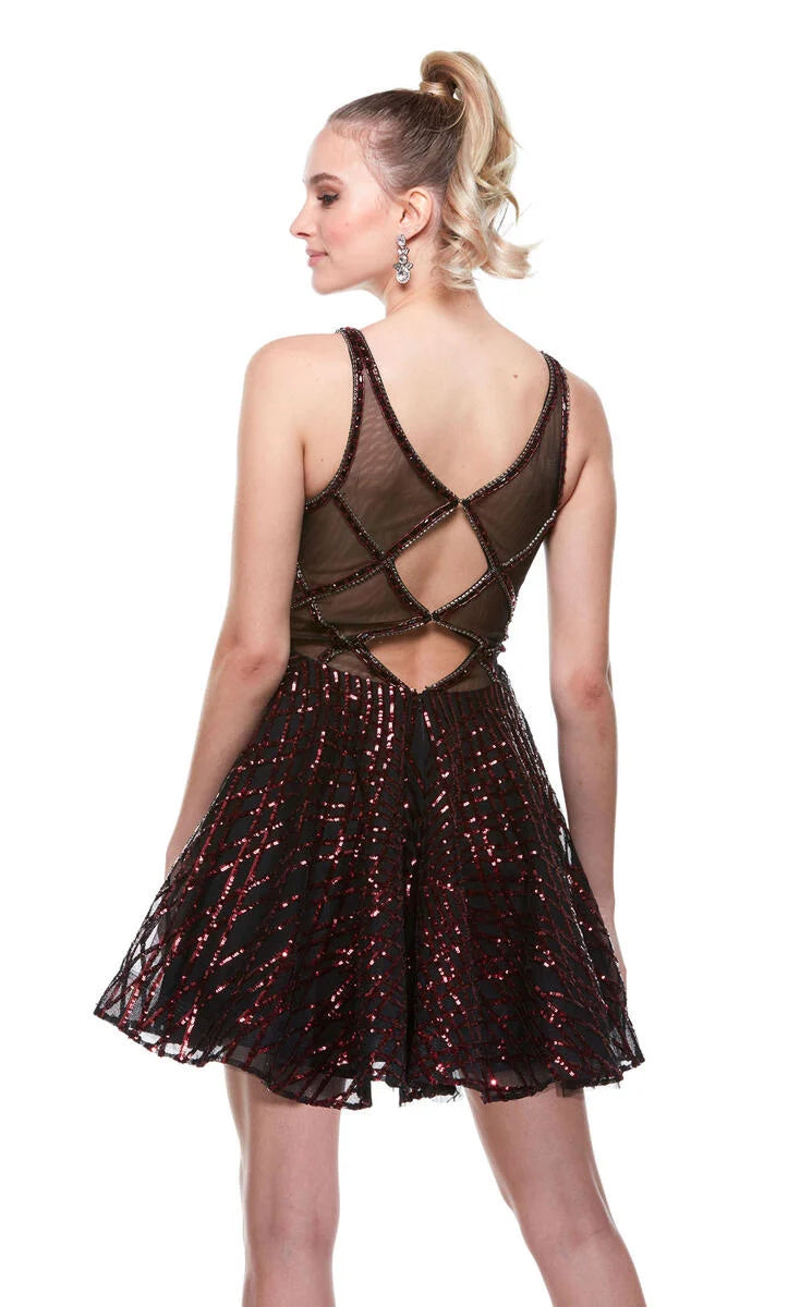 Alyce 3948 this dress has a fitted bodice and empire waistline that hugs your body in the right places. Its tulle skirt and accented straps give you a princess-like feeling. The dress has a sheer diamond-cut back and overall glitter accents.