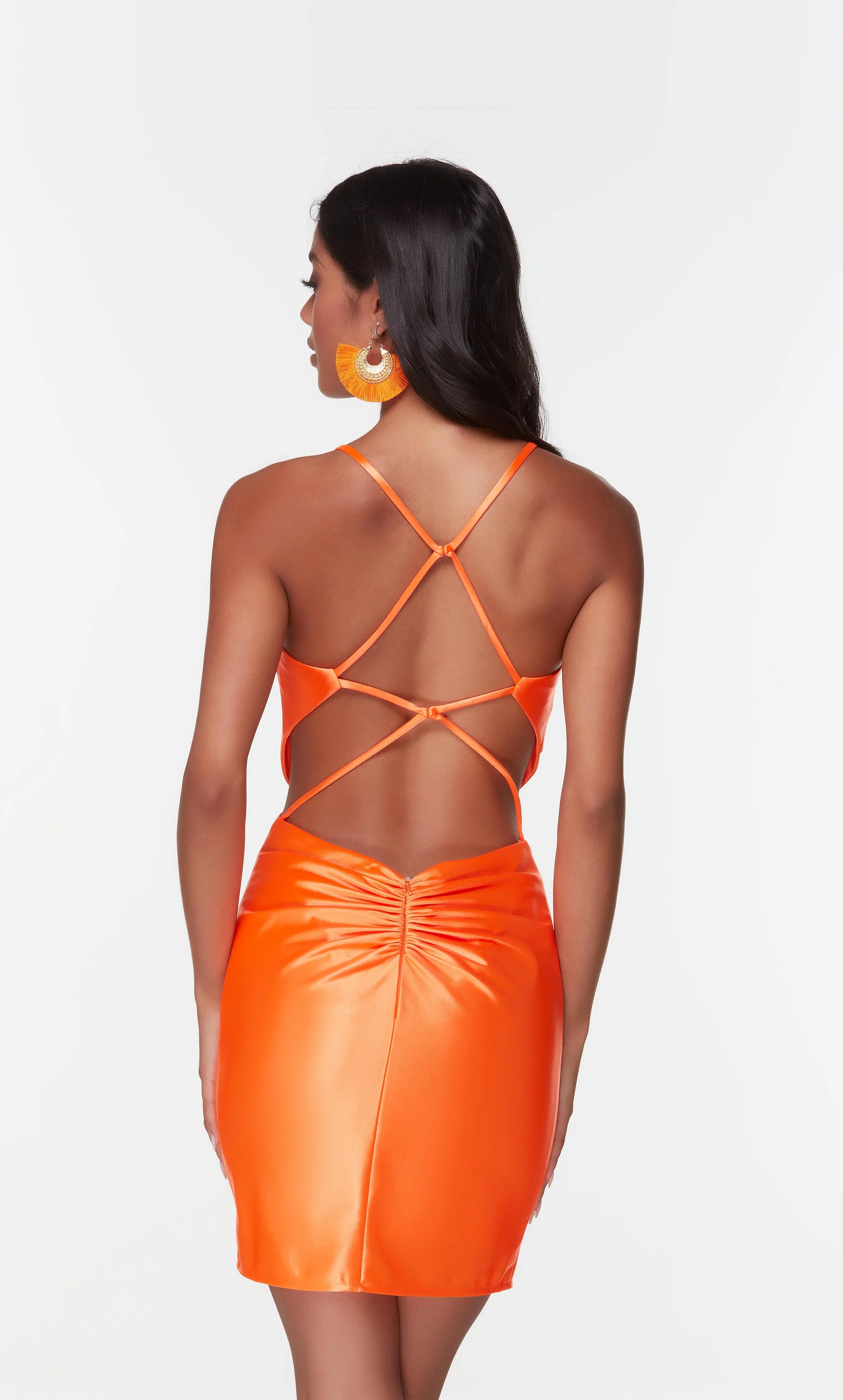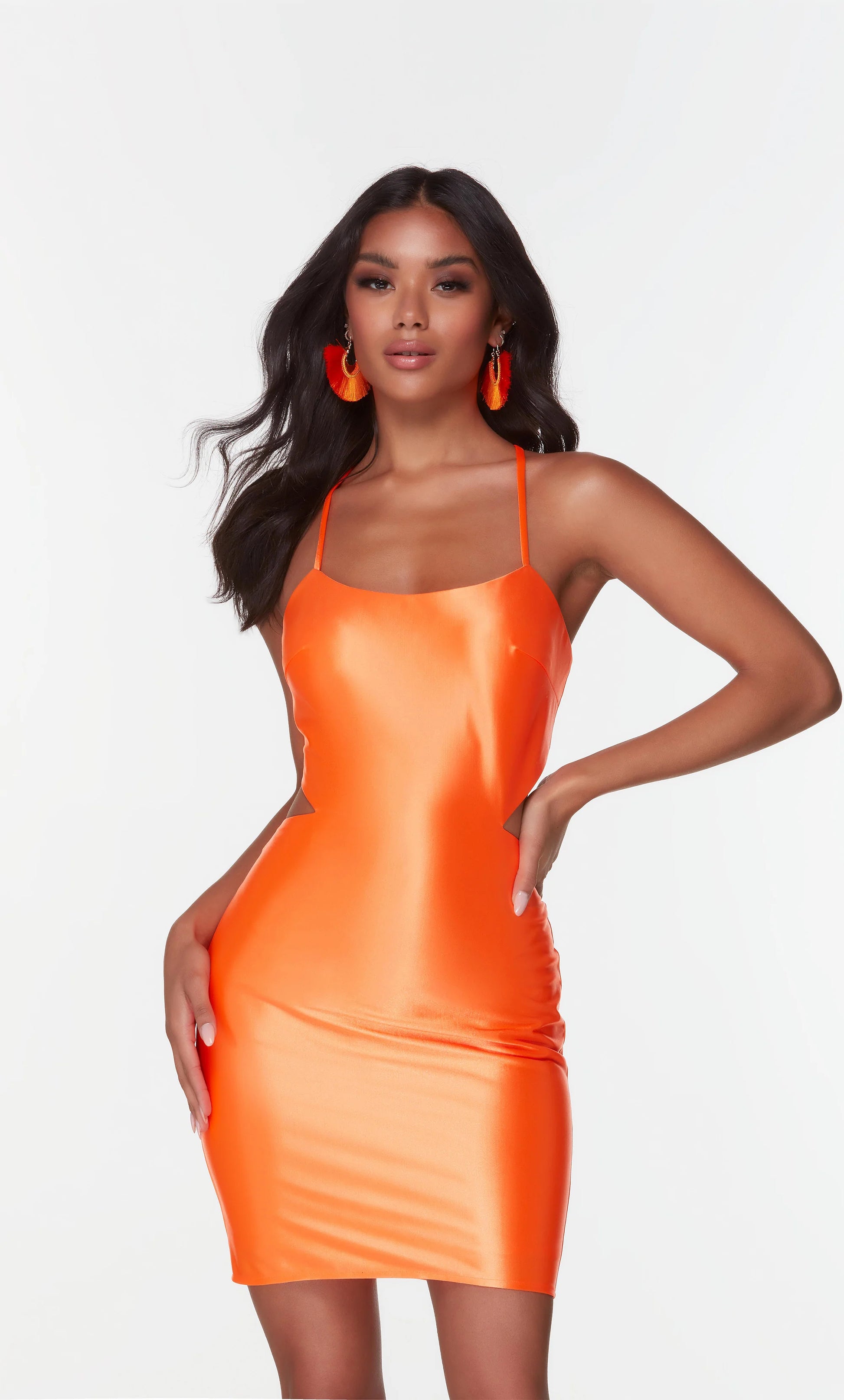 Alyce 4521 Formal Wear, Short, Stretch Satin, Scoop Neck, Straight, Strappy Back, Side Cut Outs, Ruched Styling Detail