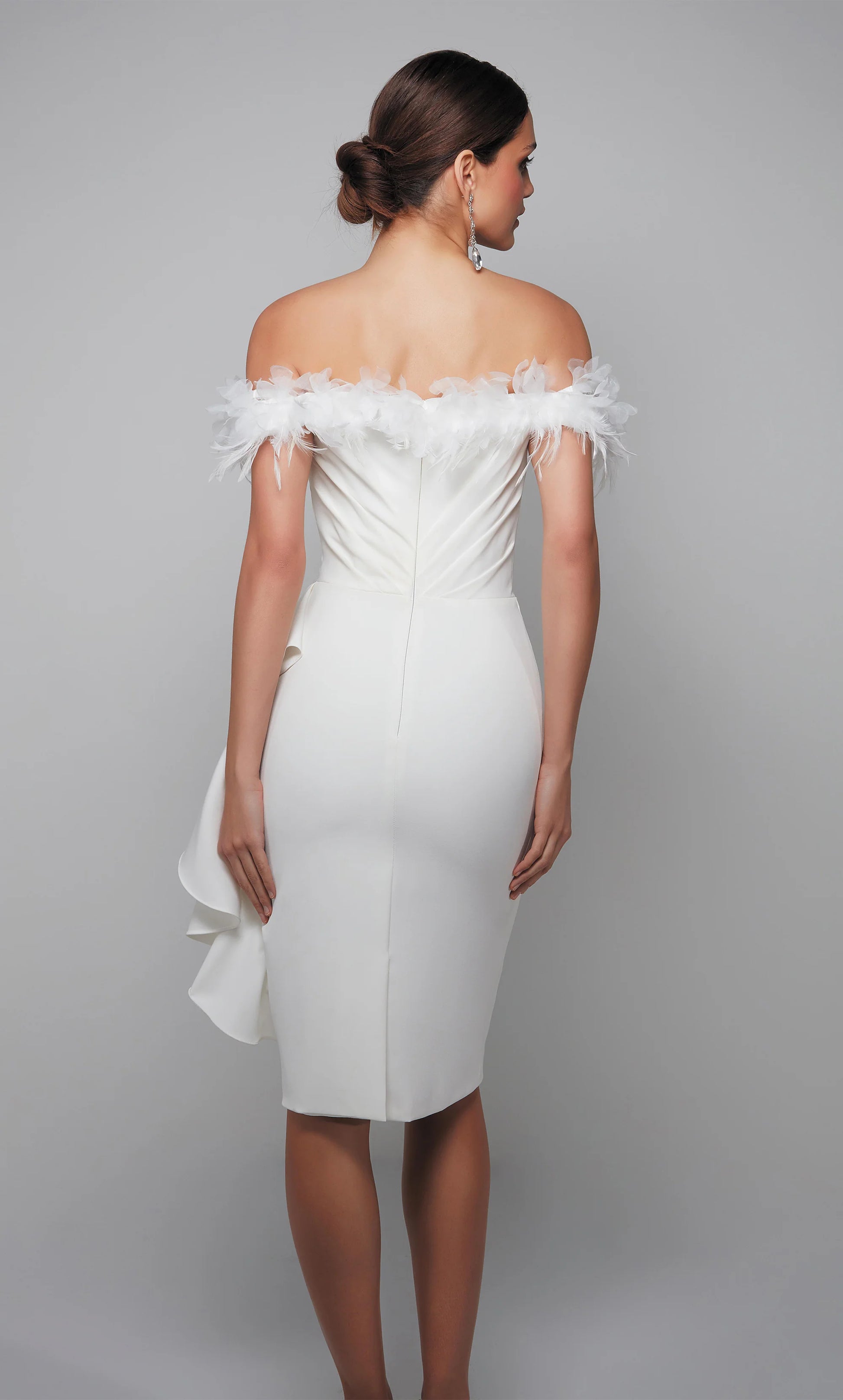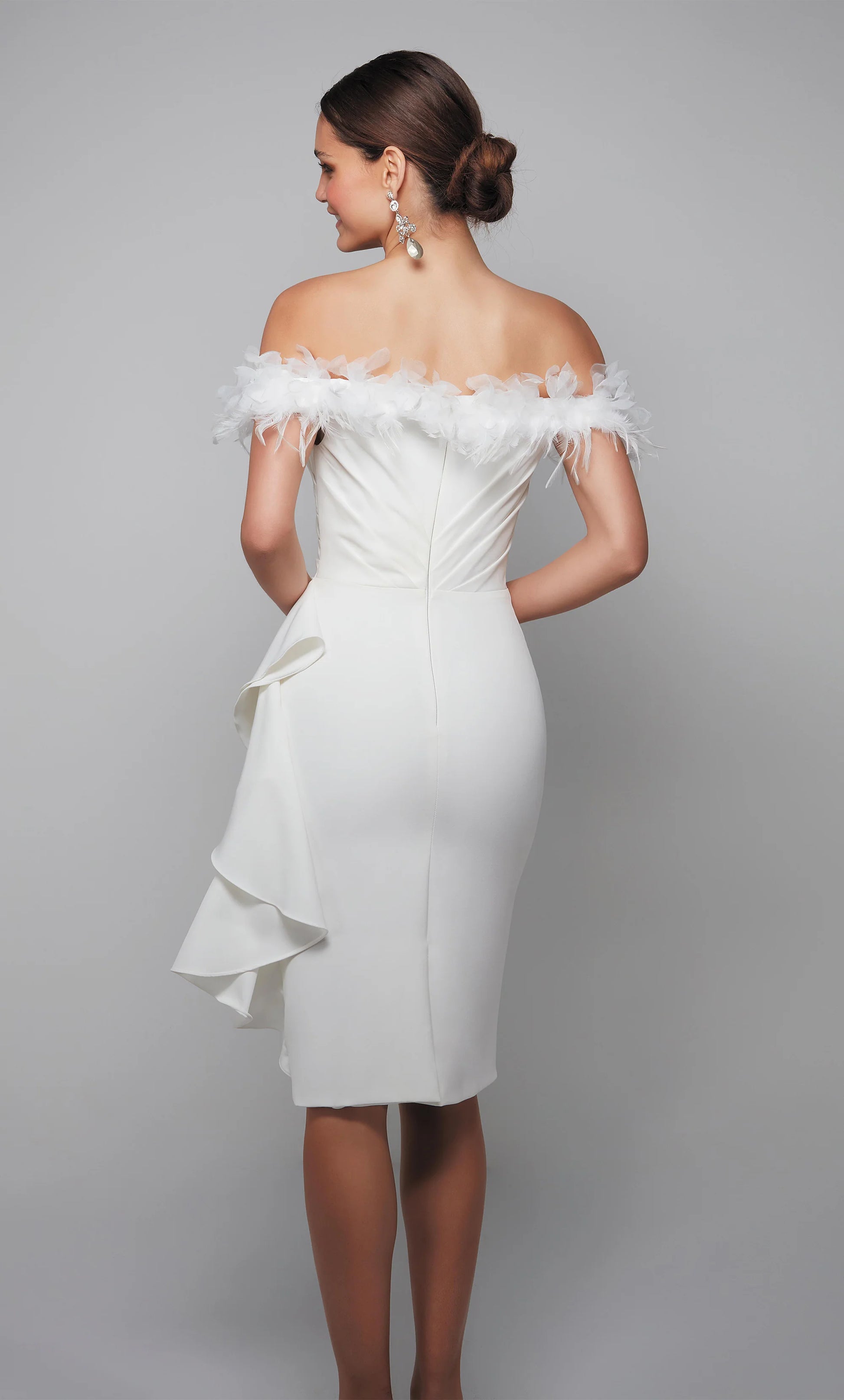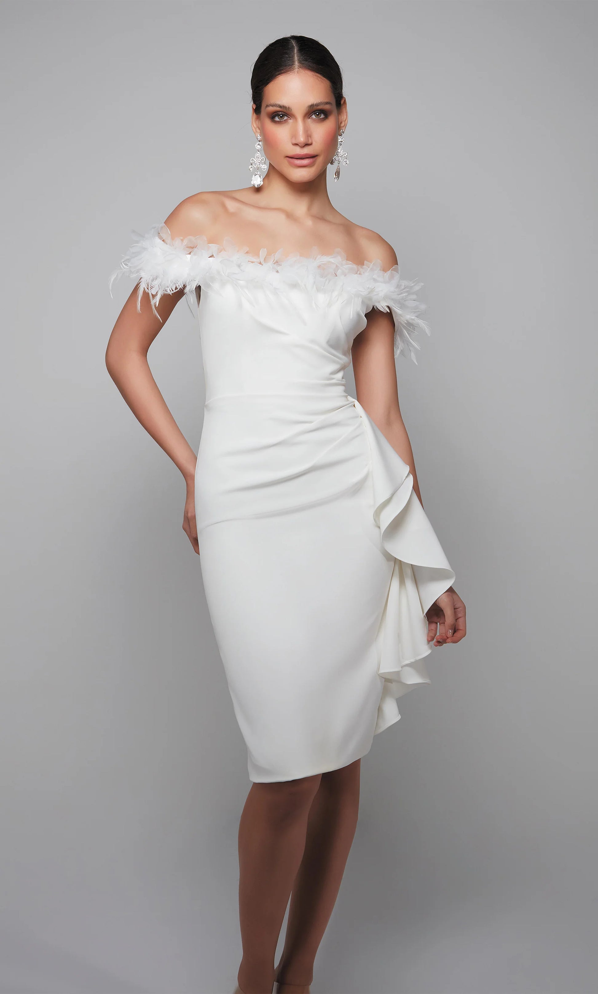 Alyce 70000 Formal Wear, Short, Italian Knit, Off The Shoulder, Straight, Closed Back, Feather Trim, Ruched Design, Side Accent Ruffle , Back Slit