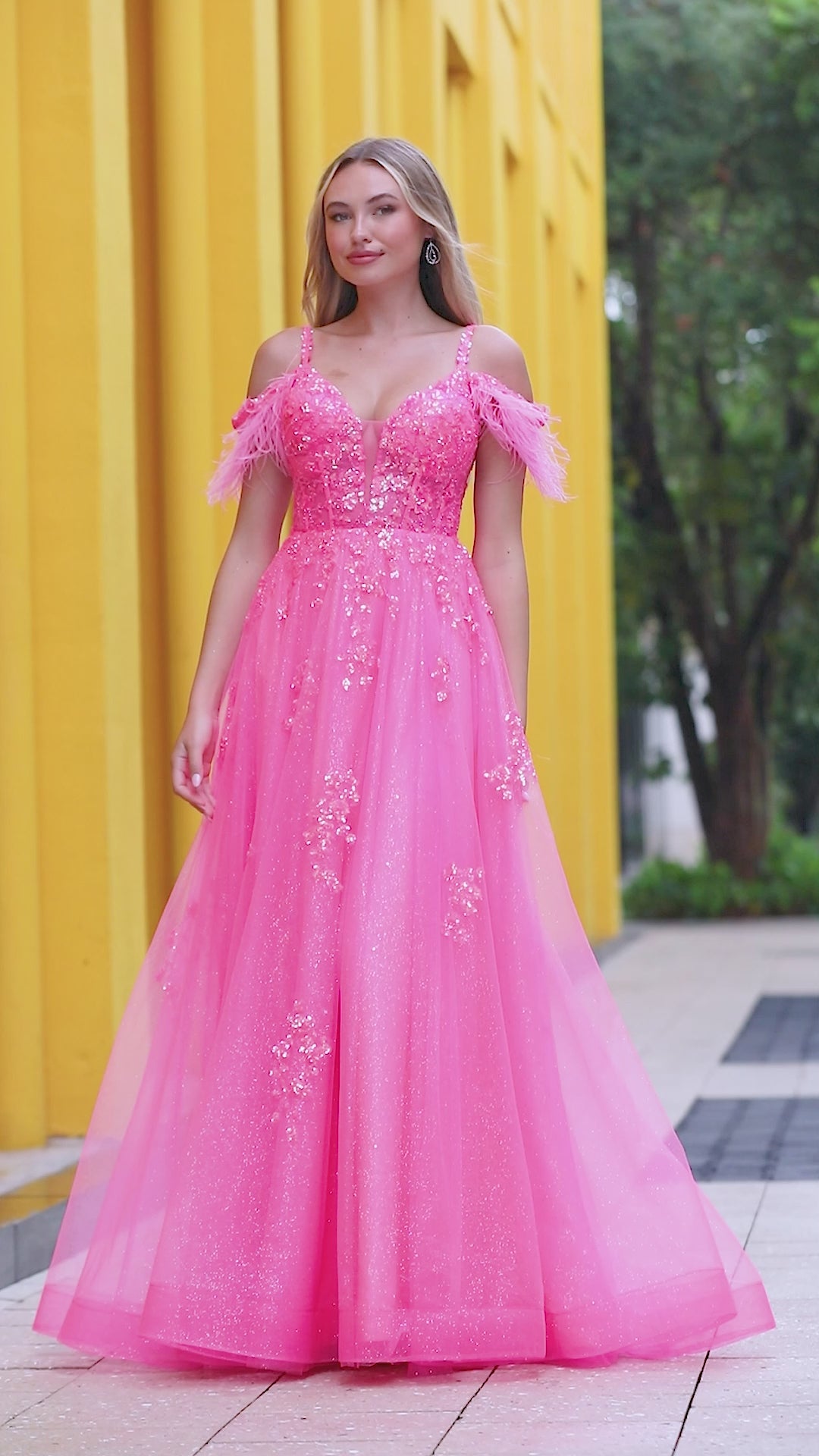 Amarra 88597 Floral sequin lace embroidered gown with a deep V neckline sheer bodice, detachable off the shoulder feather straps, and lace up back.