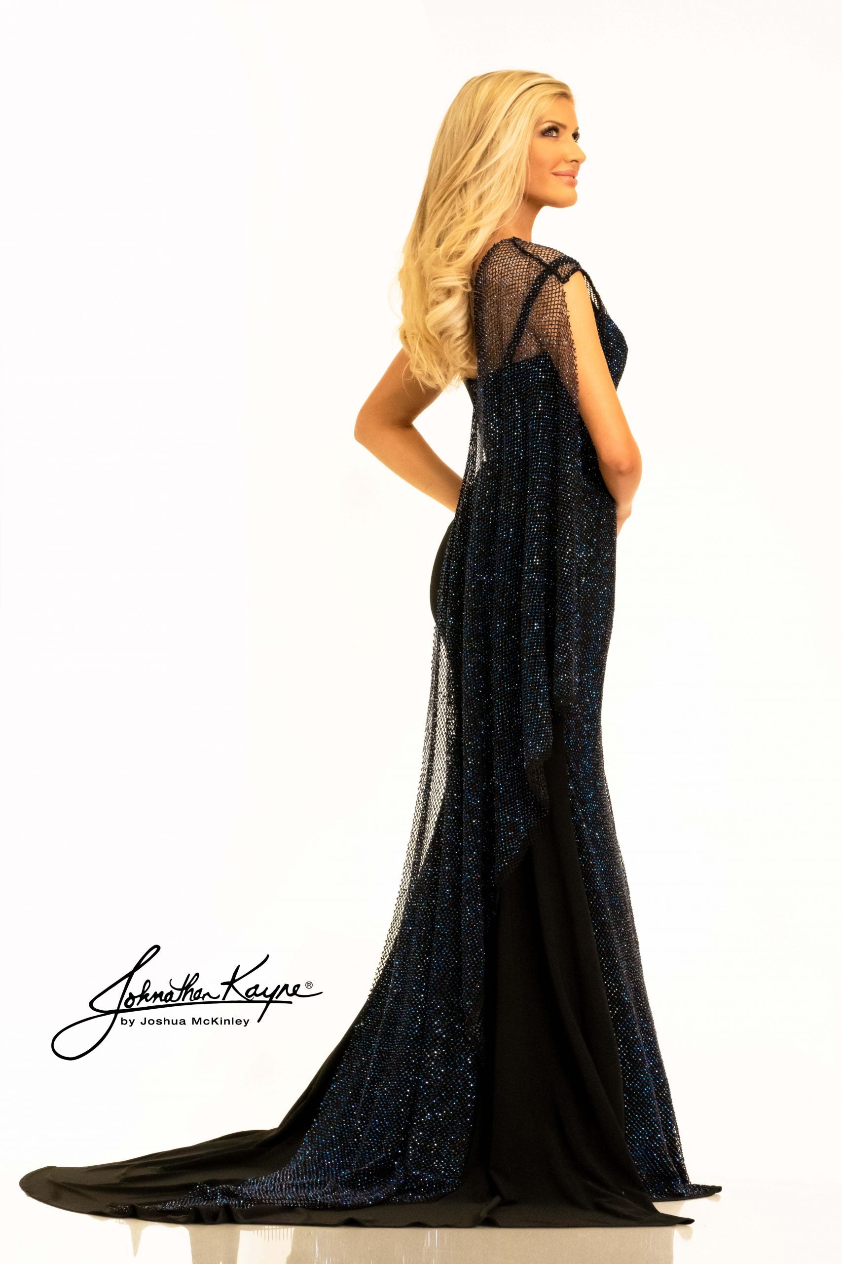Johnathan Kayne 2309 Crystal mesh is a gorgeous fabric that always helps you shine. This stunning red carpet look combines shimmer and asymmetrical style lines to create a show stopping gown.