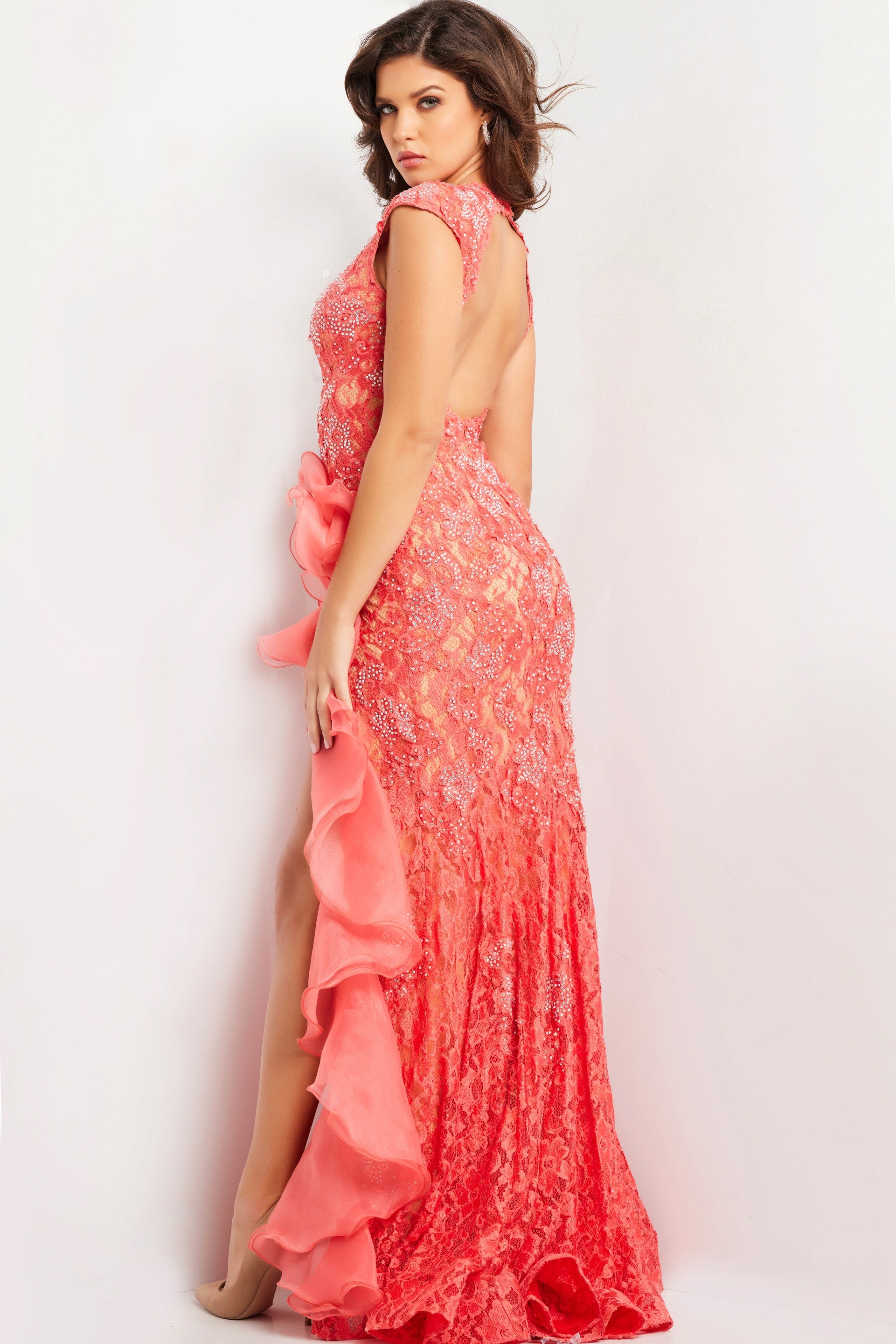 The fitted style of the dress accentuates the wearer's silhouette, providing a glamorous and flattering look. The dress is adorned with heat-set stones, adding a touch of sparkle and glamour to the intricate lace detailing. The high slit, trimmed with a ruffle, adds a modern and playful element to the design, allowing for graceful movement and a hint of leg to be revealed.