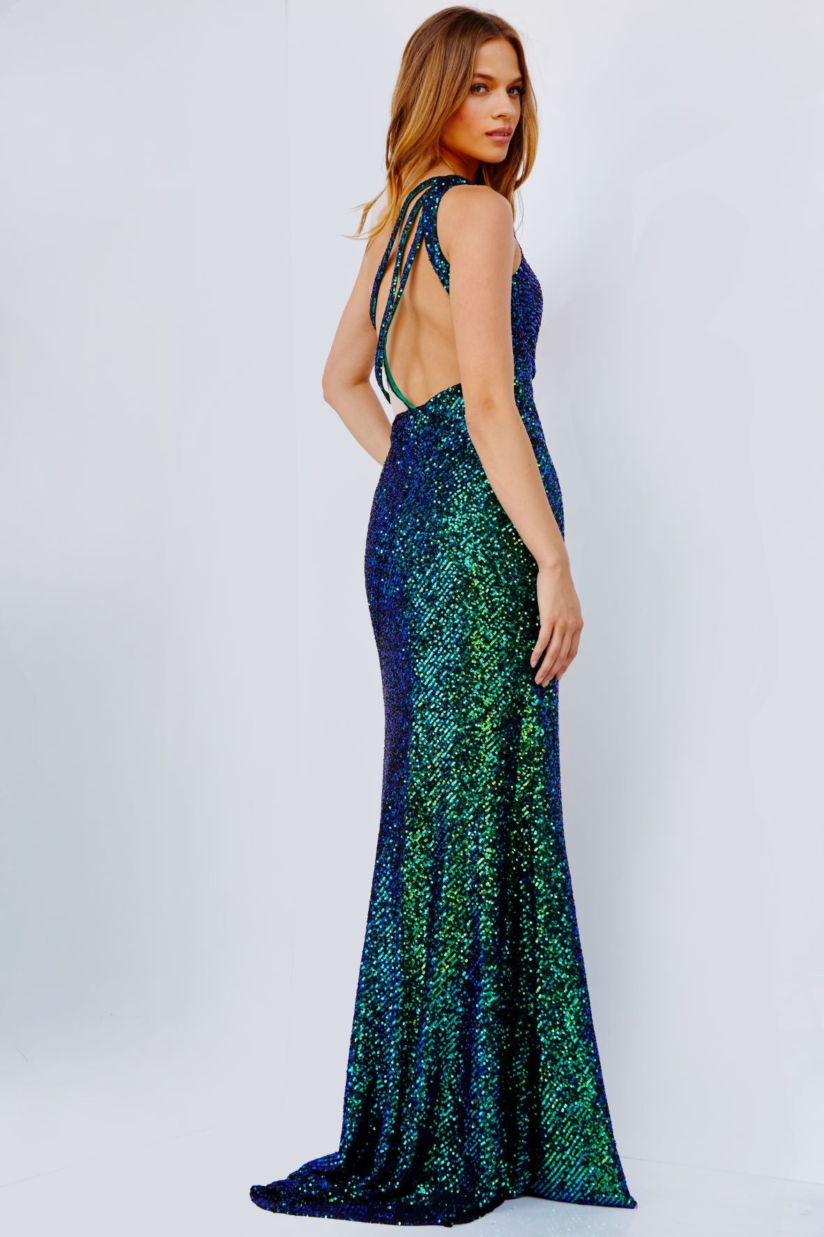 JVN by Jovani JVN23569 Beautiful dress with a sheath bodice and a sleeve that separates into three small straps that fasten to the back. Stunning sequins are used to tastefully adorn it. The sheath silhouette has a sweep train, a high side slit, and a generous hemline.