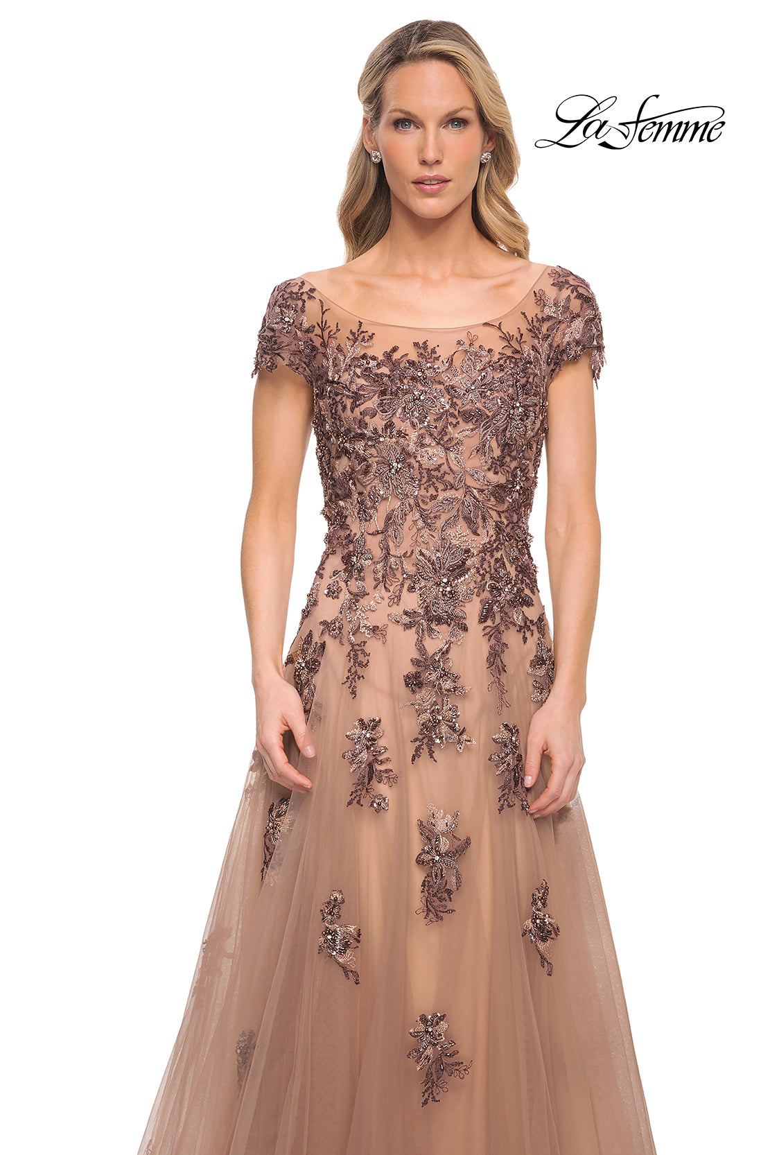 La Femme 30197 A-line tulle gown with short sleeves and gorgeous elaborate beaded design. Beaded applique cascade down the full skirt. Back zipper closure.