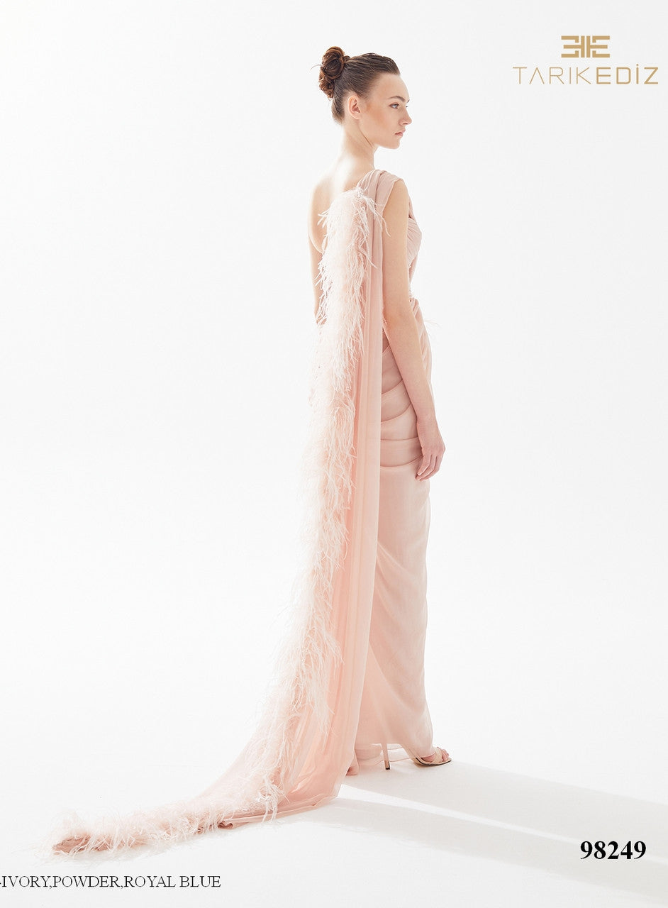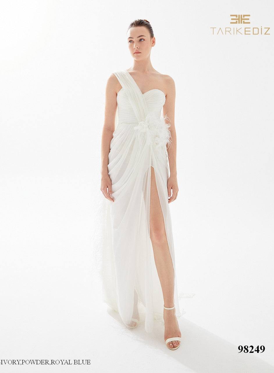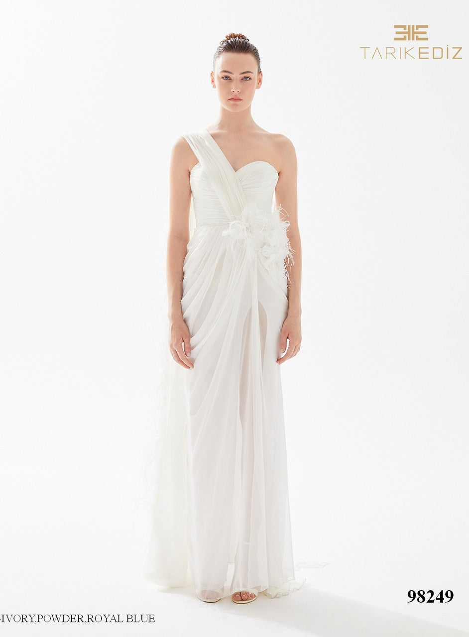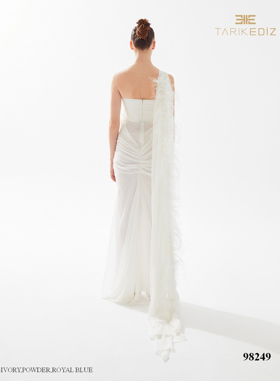Tarik Ediz 98249 corset bodice with a sweetheart neckline and sleeves that appear to have one shoulder.