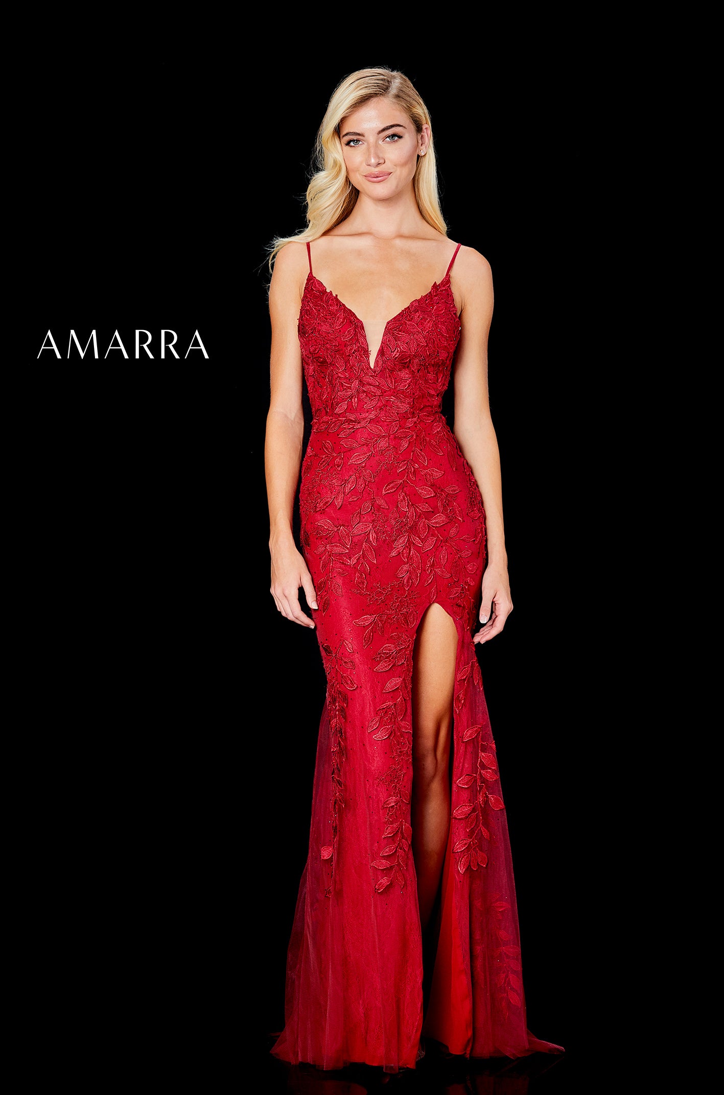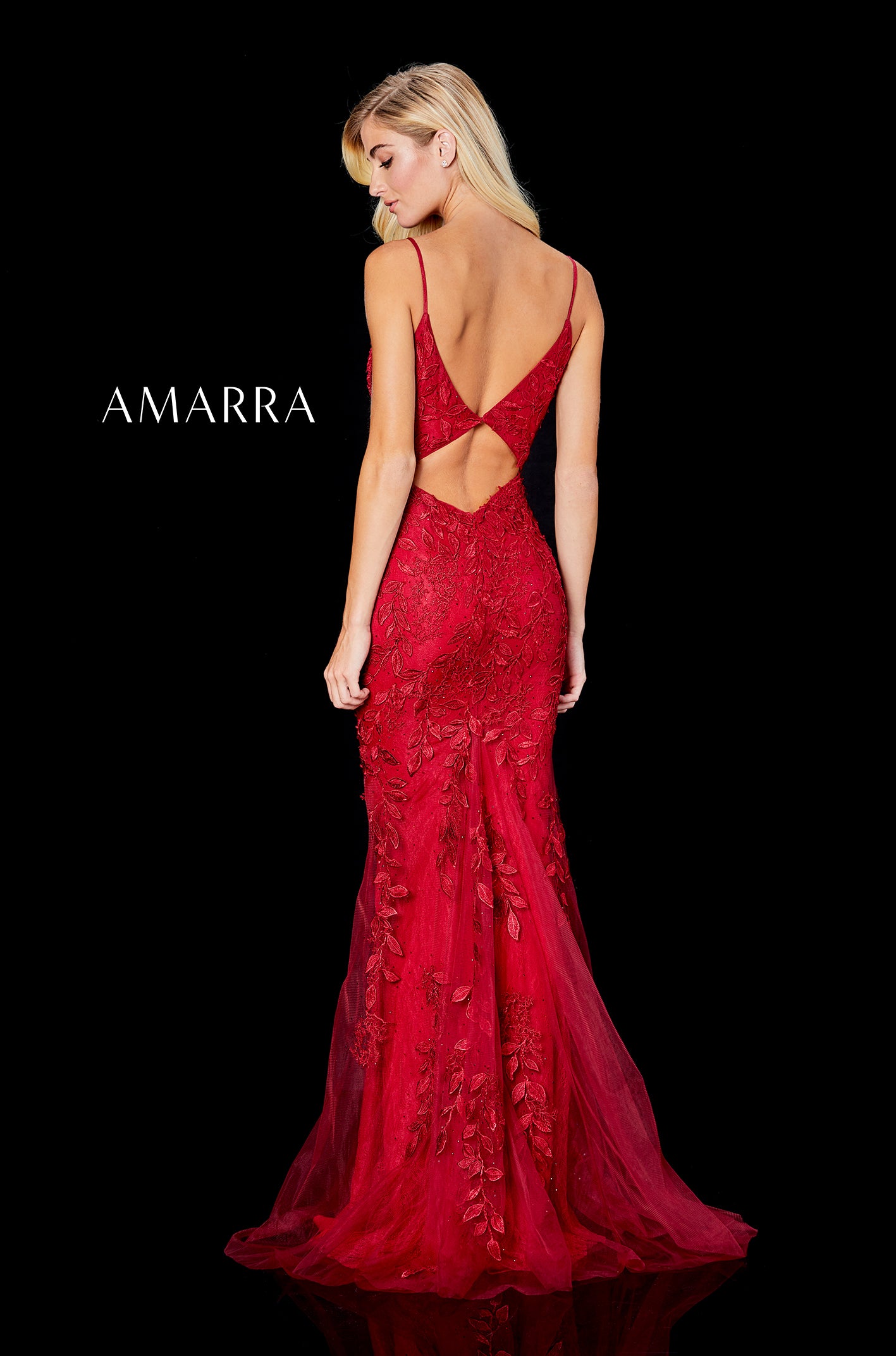 Amarra 20042 Fitted gown with a plunging v-neck, embellished lace throughout the gown, cut out low back, and a sweep train.