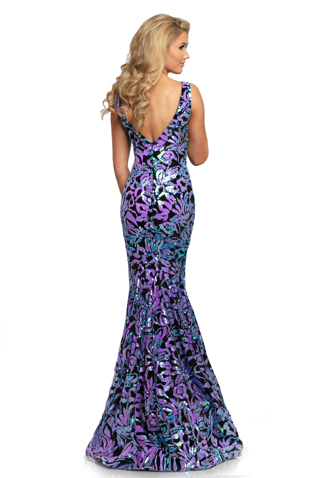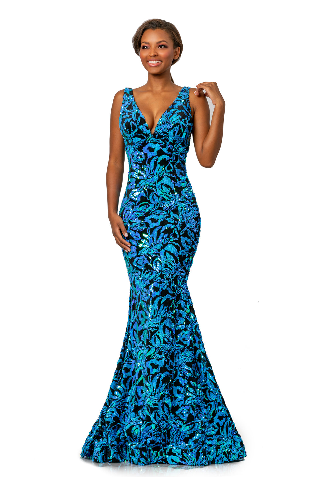 This beautiful stretch sequin velvet gown is one of our best sellers. Keeping a classic silhouette in the tank empire bodice and sweep train while adding six colors of fun in reversible sequin.