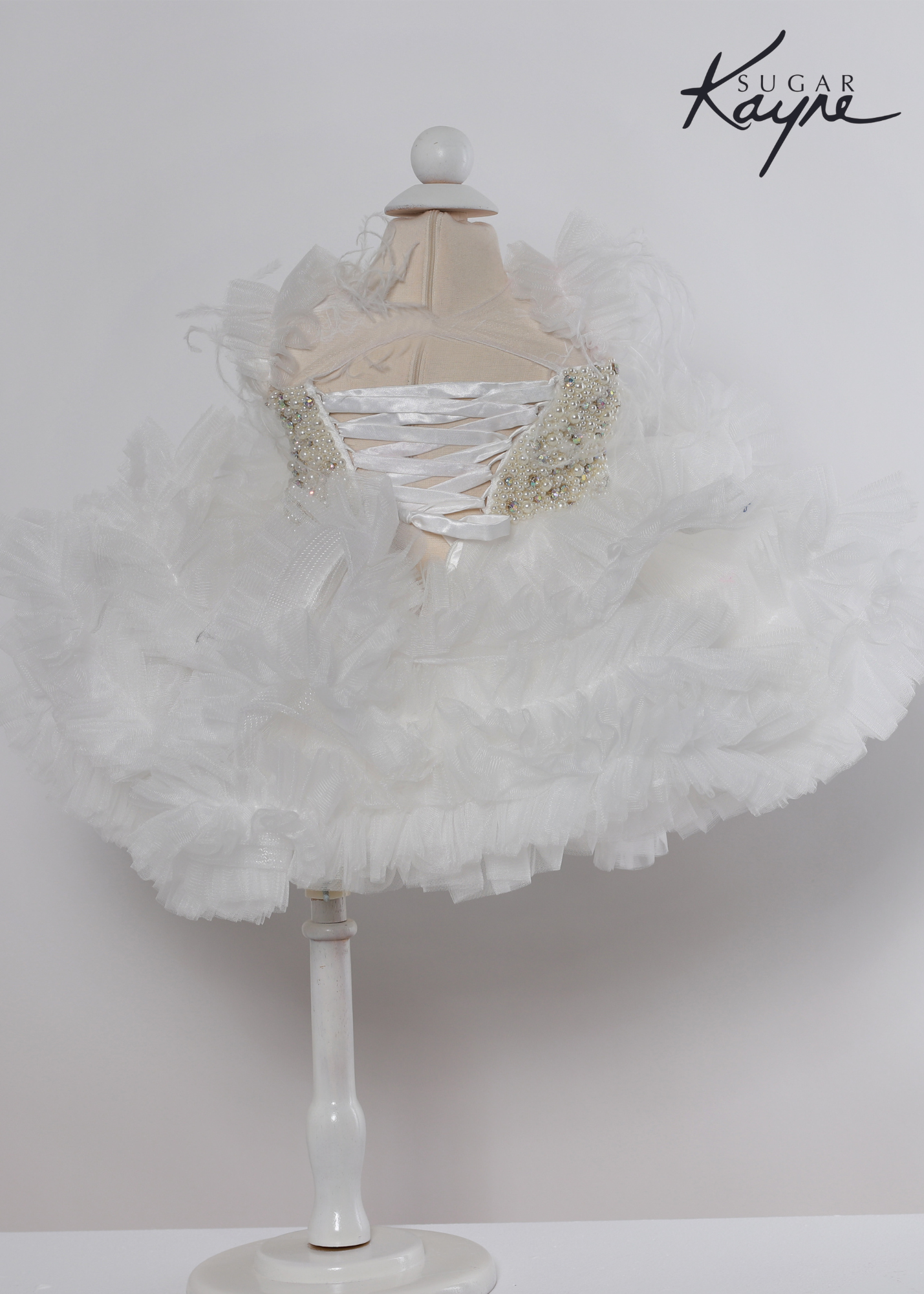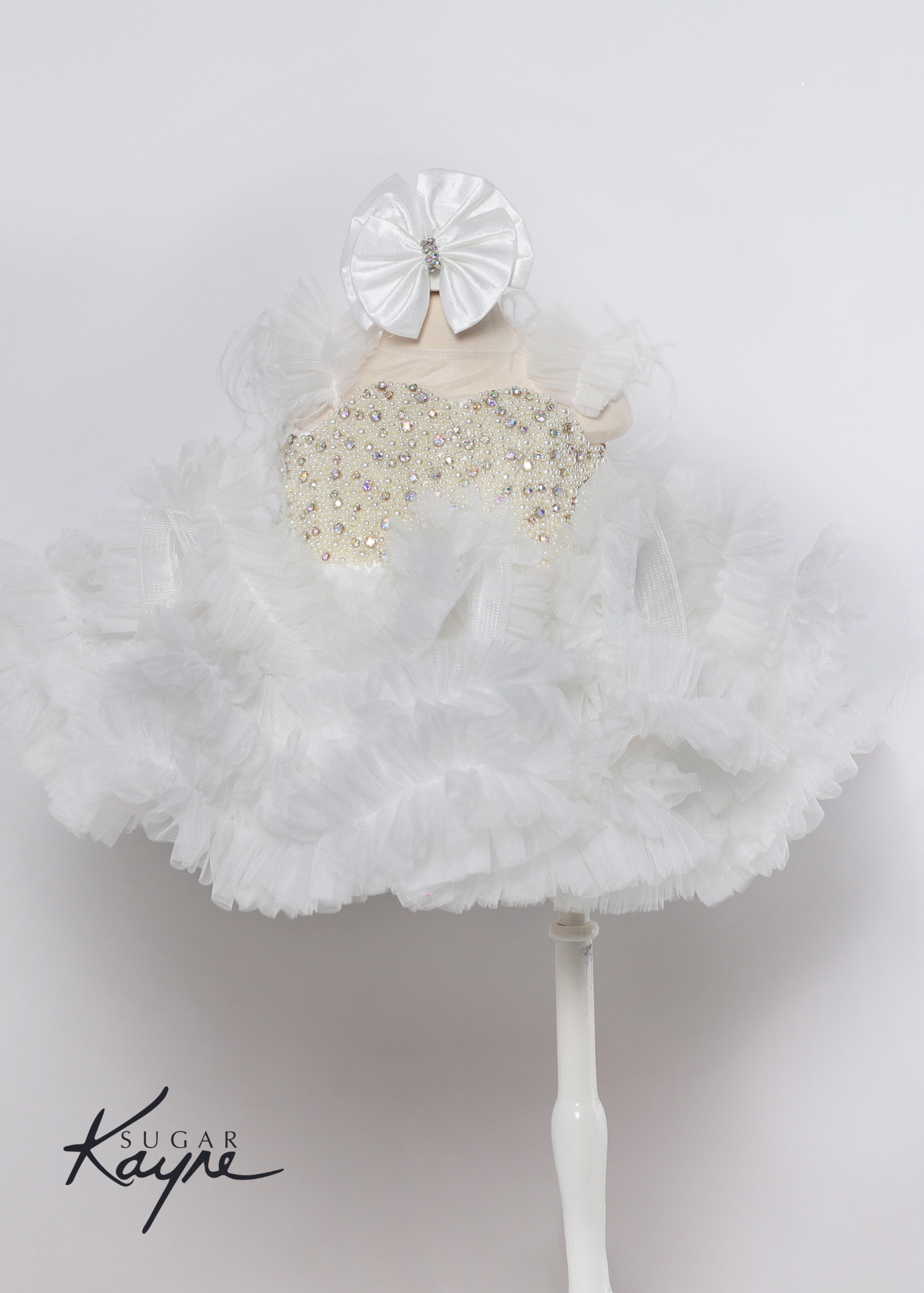 Have your little cupcake bring on all the charm in this stunning mesh gown accented with pearls. The corset back is the perfect addition as the little one grows!