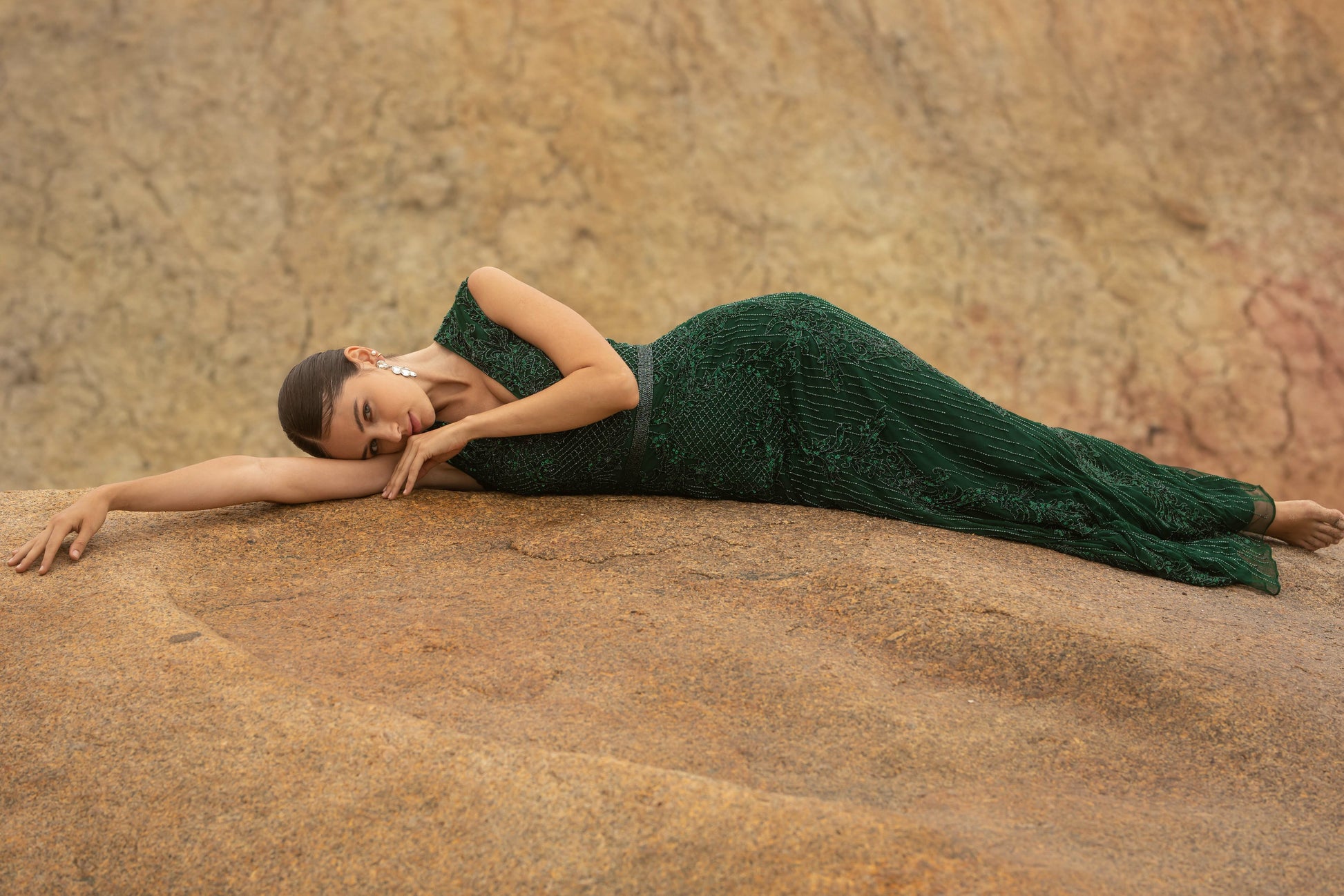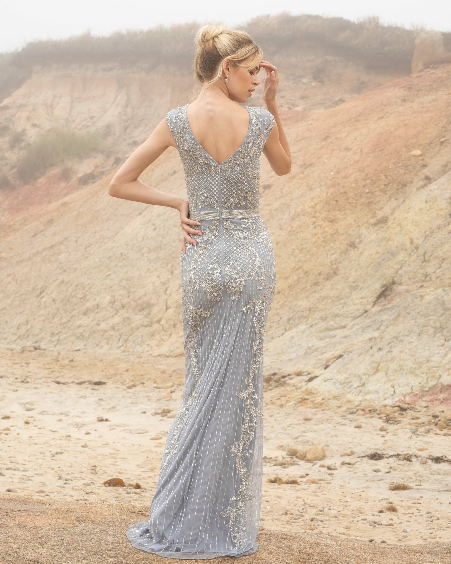 Primavera Couture 3581 this full-length sheath silhouette dress boasts stunning beadwork featured with a mirrored V neckline and back, cap sleeves, and beaded set-on band highlighting the natural waist.