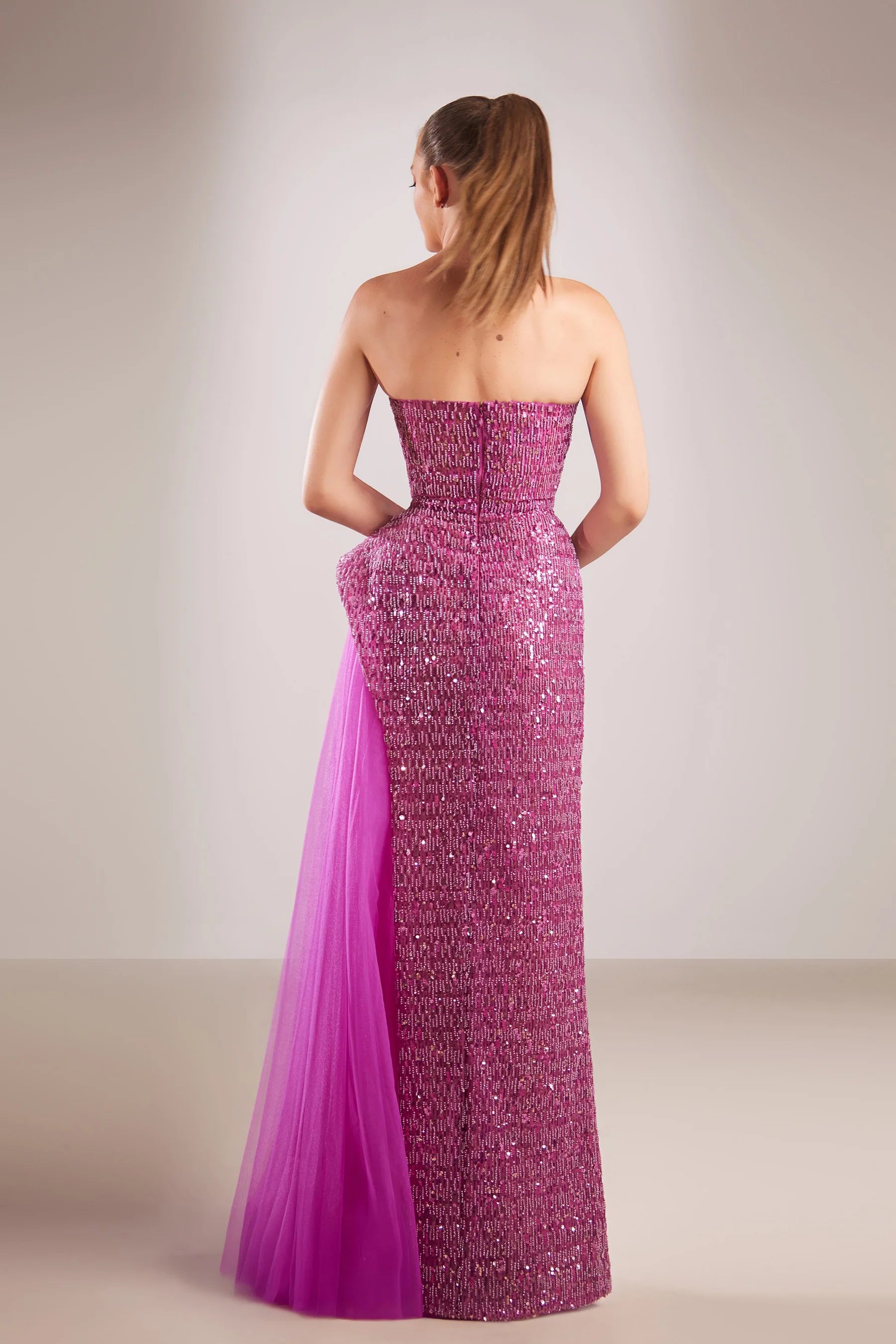 Reverie Couture FW194 is an expertly designed evening gown that embodies elegance and sophistication. Its shimmering sequin fabric contours the body in a sleek, floor-length column silhouette. The one-shoulder neckline and asymmetrical cuts provide a contemporary and refined aesthetic, while the layered tulle side skirt, visible through a dramatic slit, introduces a graceful interplay of structure and fluidity. This gown ensures a memorable presence at any formal occasion.