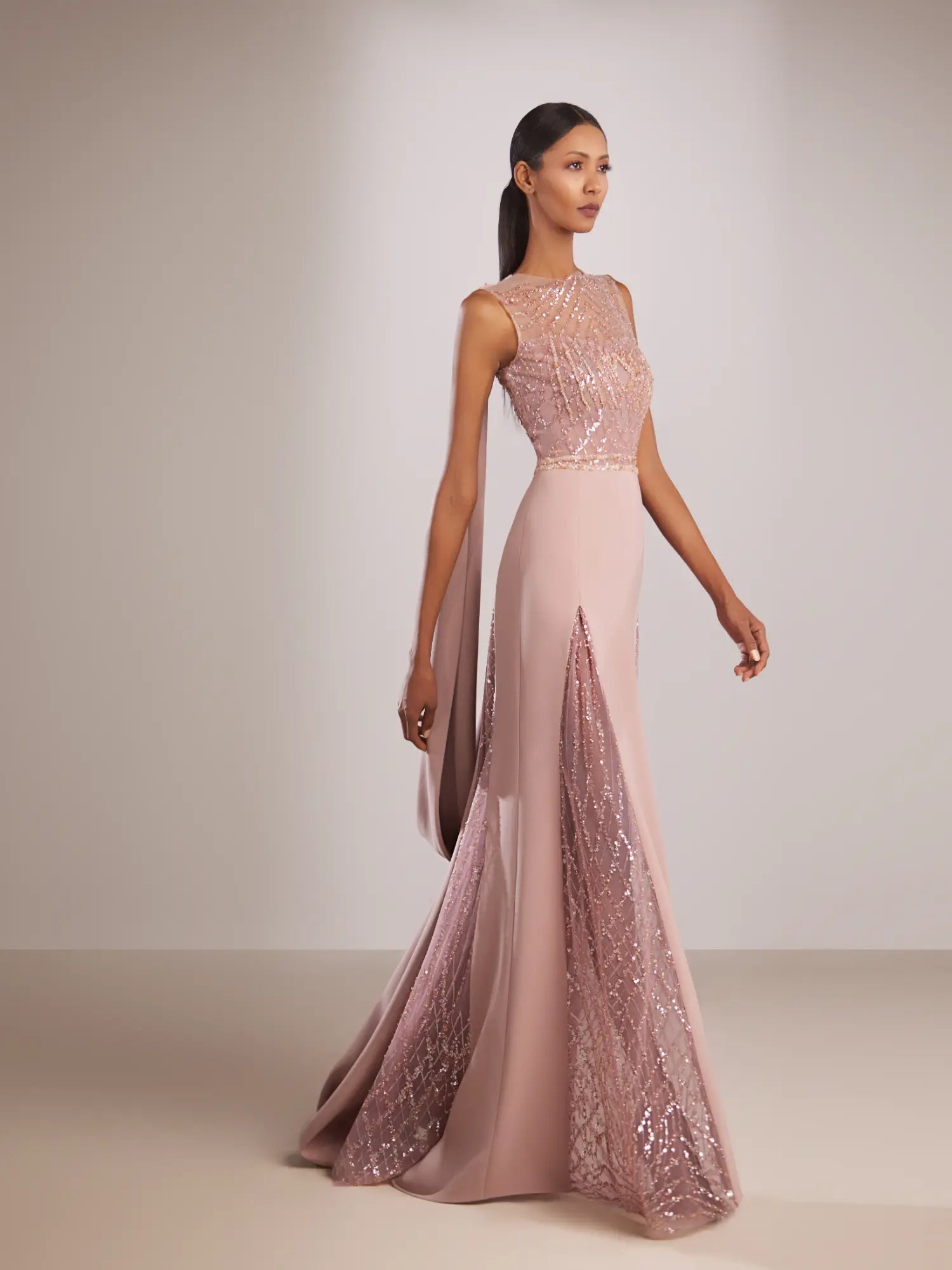 This sleeveless pink gown features an intricately beaded bodice that enhances its elegant silhouette. Designed with beaded panels along a subtle side slit, it offers a delicate balance of sophistication and allure. The soft, flowing cape adds a dramatic yet refined touch, completing a look that is both graceful and commanding, perfect for formal occasions.