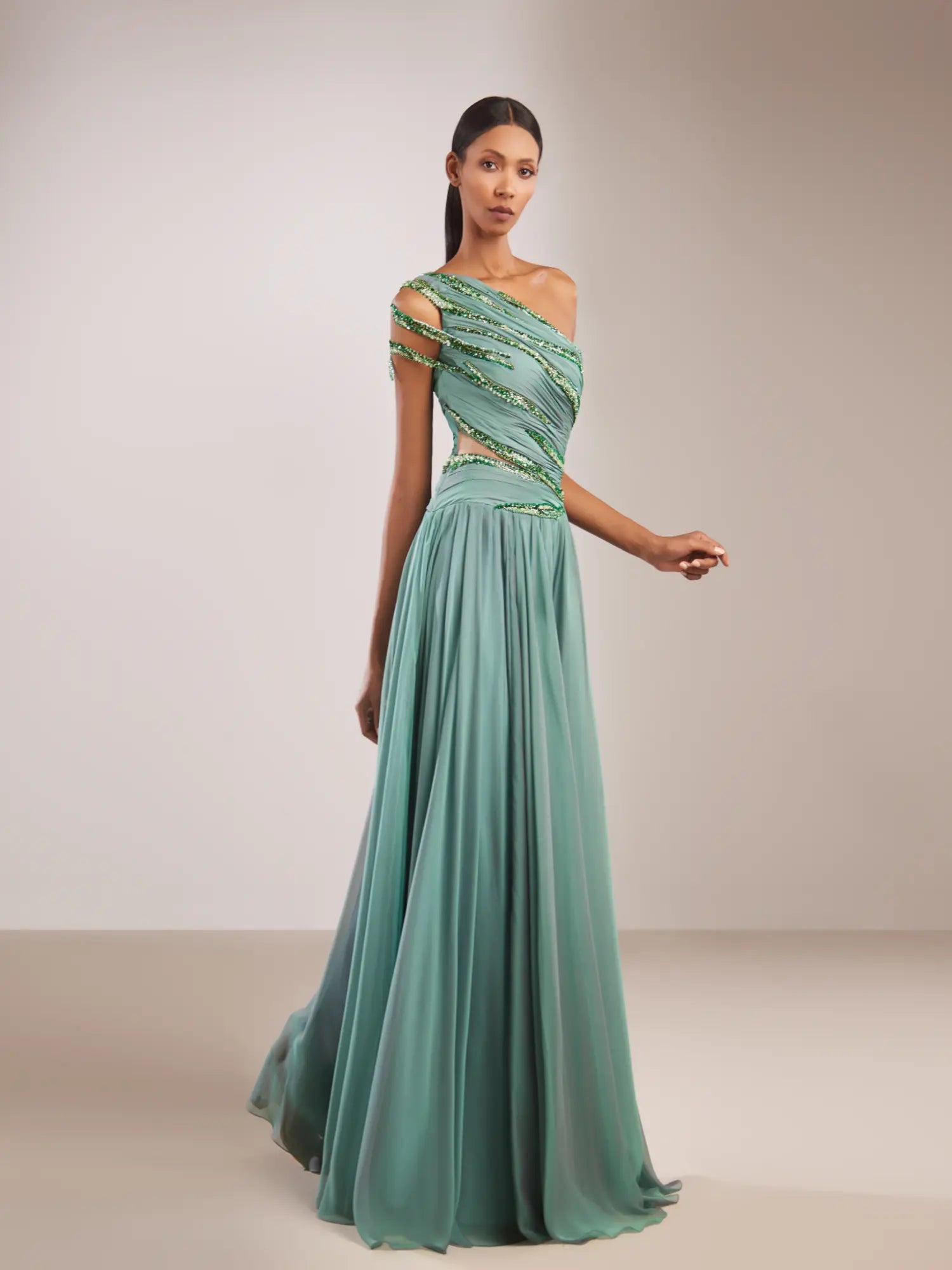 This one-shoulder Reverie Couture FW212 gown features a ruffled neckline adorned with thread and sequin-beaded details that gracefully extend into an elegant back train. The mermaid crepe skirt offers a sleek silhouette, combining refined craftsmanship with sophisticated design for a striking formal look.