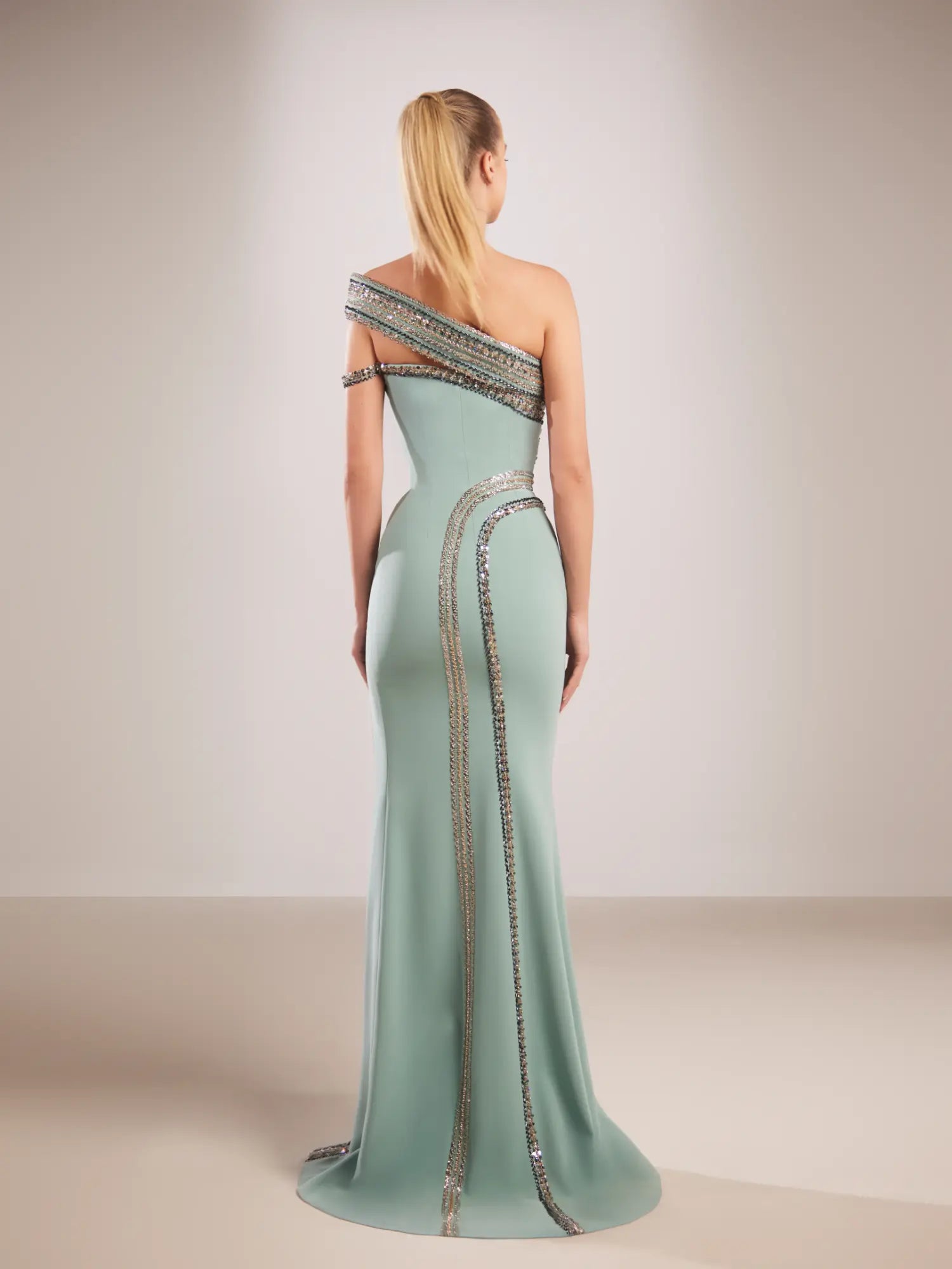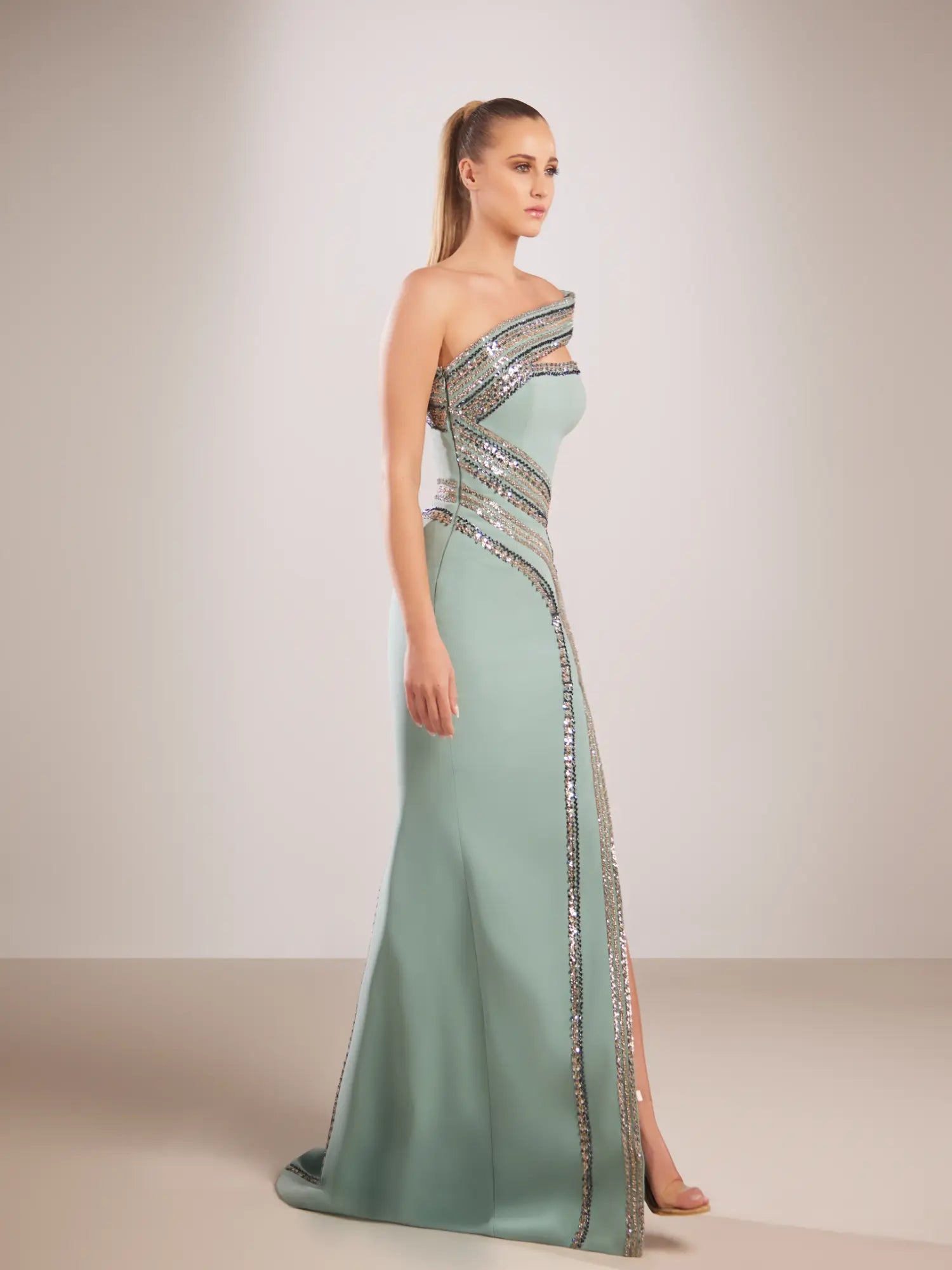 Elevate your evening elegance with the Reverie Couture FW214, a sage green one-shoulder gown that seamlessly blends sophistication and edge. Its asymmetrical beaded bands add refined texture and visual intrigue, while the high slit enhances movement and allure. This gown offers a modern silhouette perfect for special occasions demanding a bold yet graceful statement.