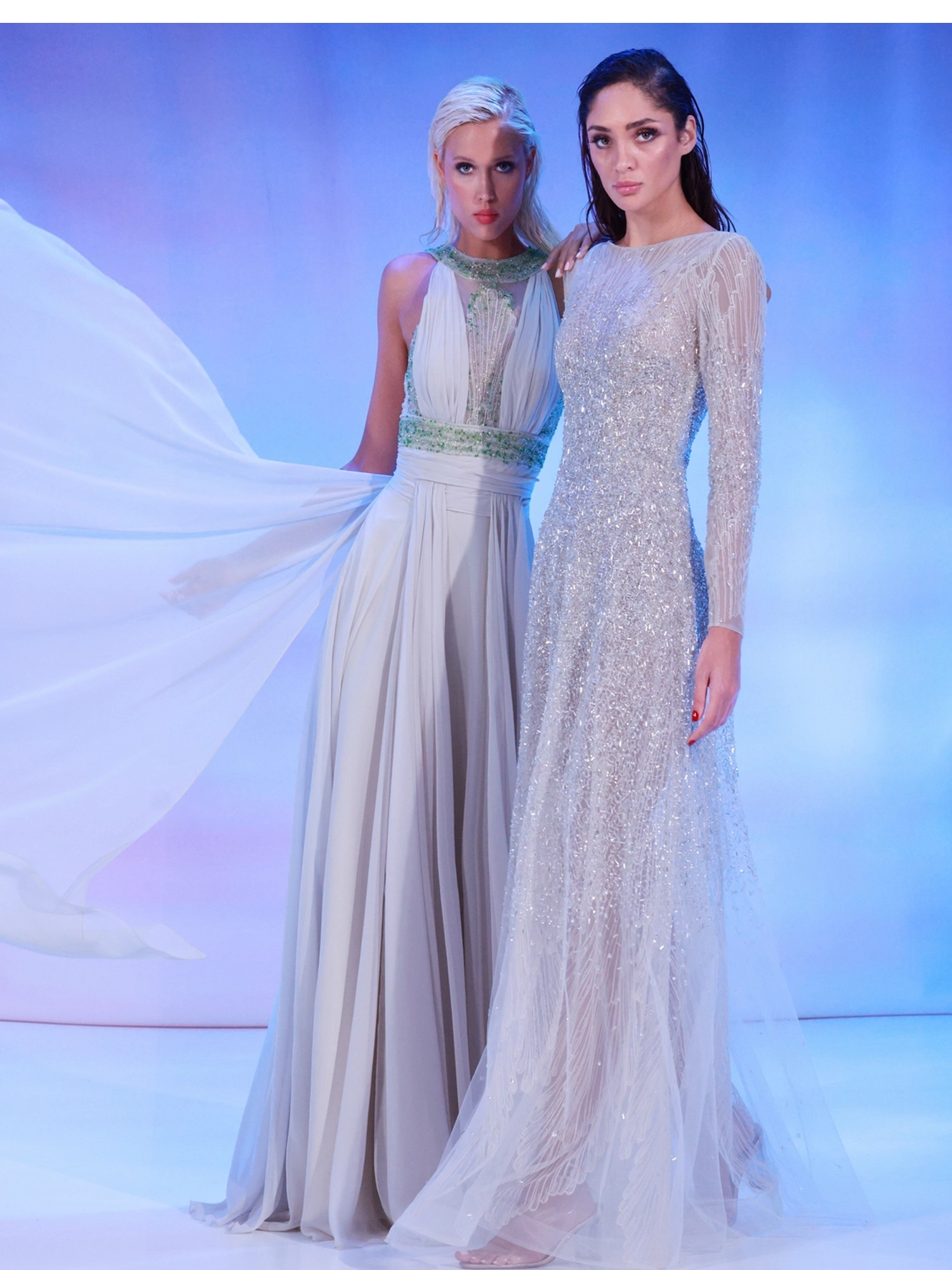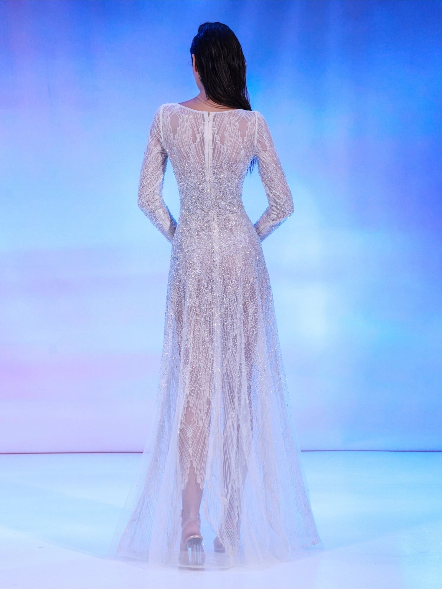 The Reverie Couture SS176 dress showcases refined craftsmanship with its delicate sea shell threadwork artfully paired with silver embroidery. Designed with long sleeves and an elegant A-line skirt, this nude dress offers a sophisticated silhouette that enhances grace and poise for any occasion.