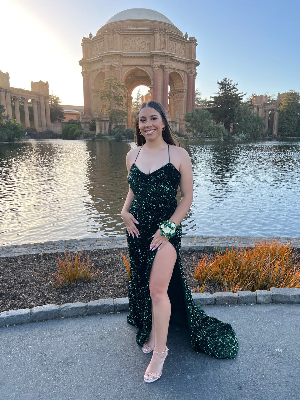 Perfect lace up sequin dress for prom. Select colors and sizes available to ship in 24 hours. Please call or chat with us to learn which are available since inventory changes hourly. Custom color options available for $80 additional and needs 6 weeks production.