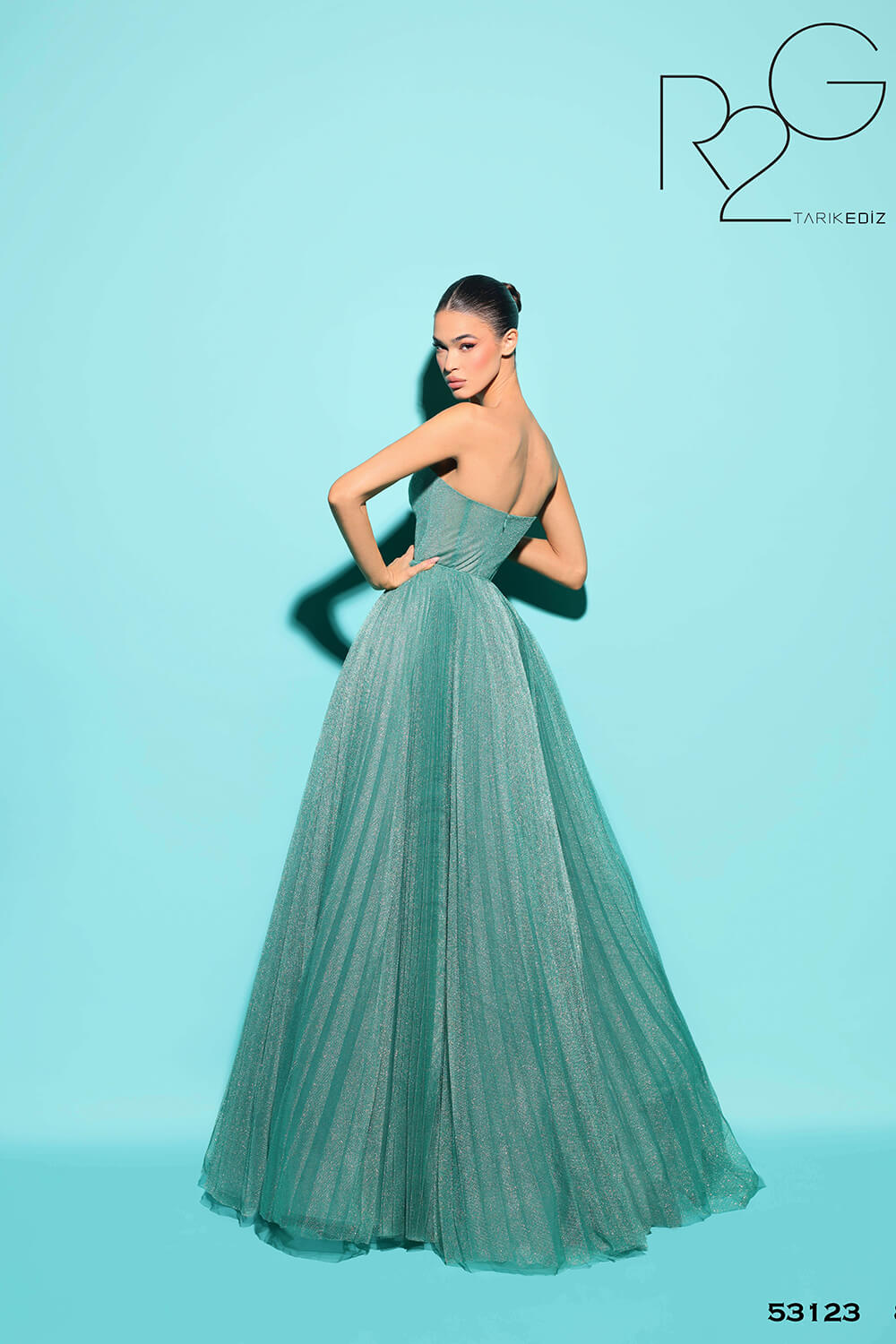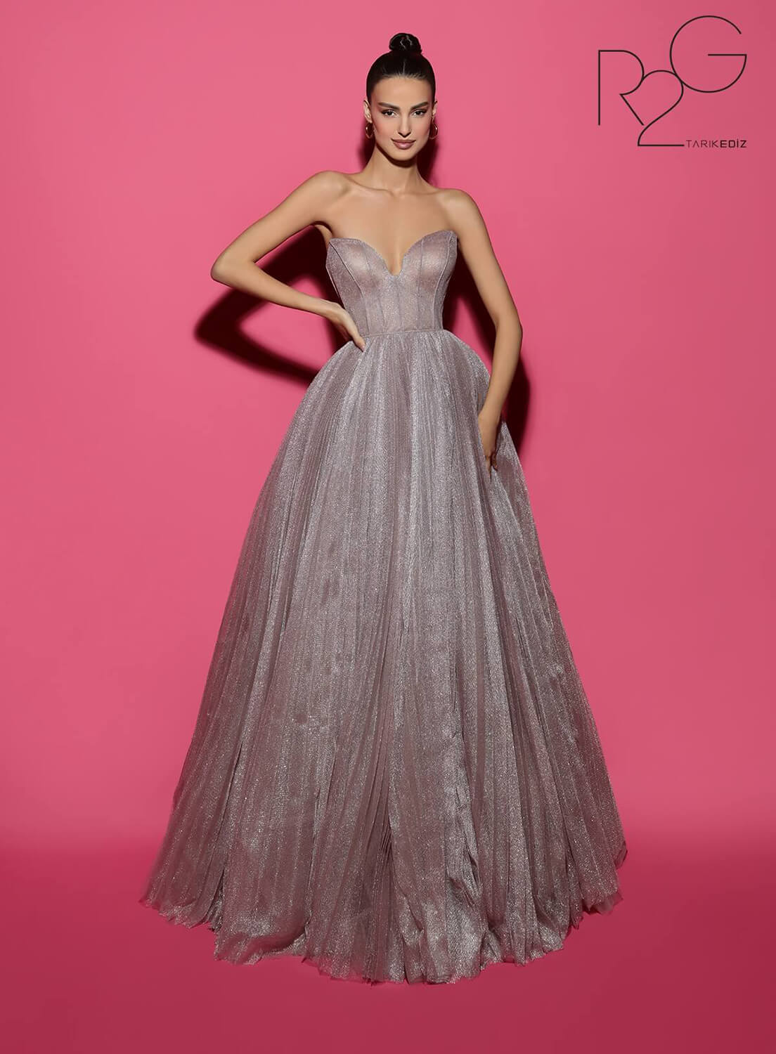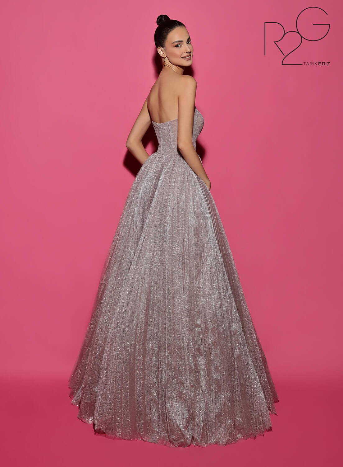 Tarik Ediz Style 53123 invites you to embrace regal glamour with its glitter tulle fabric, V-neck neckline, ball gown silhouette, pleating, corset details, zipper back, and strapless design. Make a grand entrance at evening events or prom with this enchanting and unforgettable masterpiece.