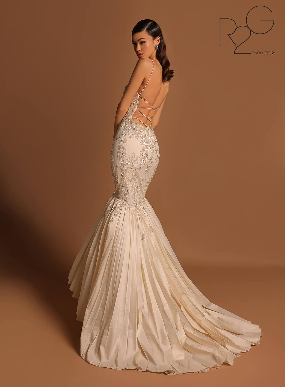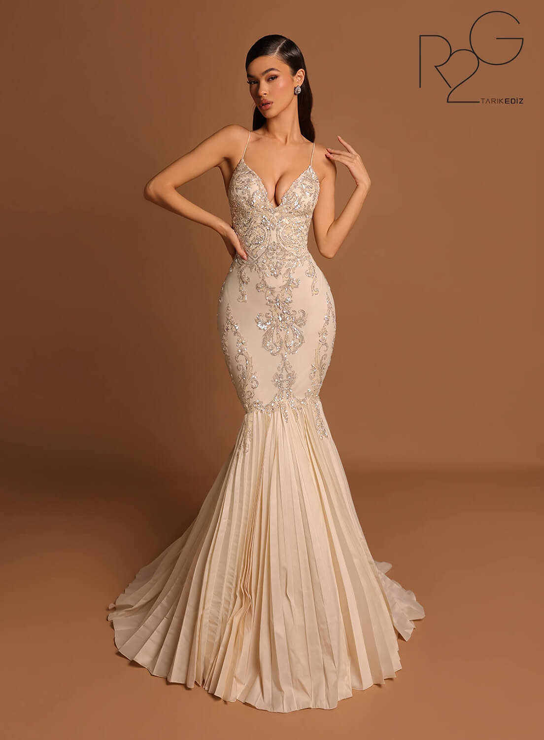 Tarik Ediz Style 53149 invites you to experience the allure of Taffeta Beaded fabric, a V-neck neckline, a mermaid fitted trumpet silhouette, train details, long length, corset lace-up back, and delicate straps. Elevate your evening with a gown that radiates timeless beauty.