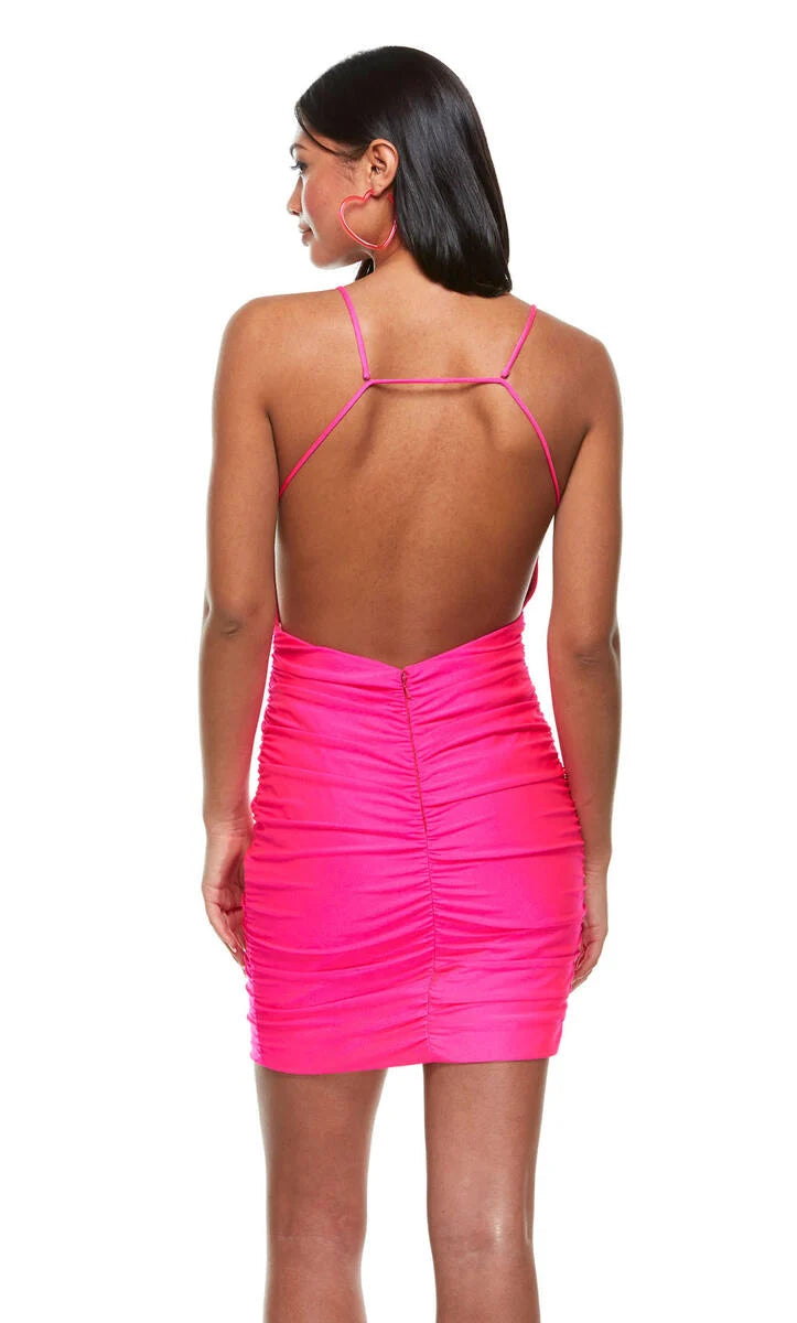 Alyce 4406 This dress has a V-neck with knot and keyhole detailing. Its strappy sleeves with a backless design are what makes this dress stand out from the rest. This dress with a bodycon silhouette has a gathered detailing at the skirt’s back along with a zipper to give you a tight fit.