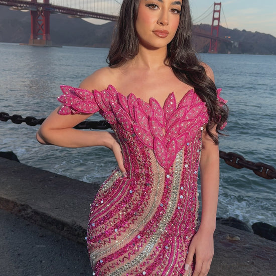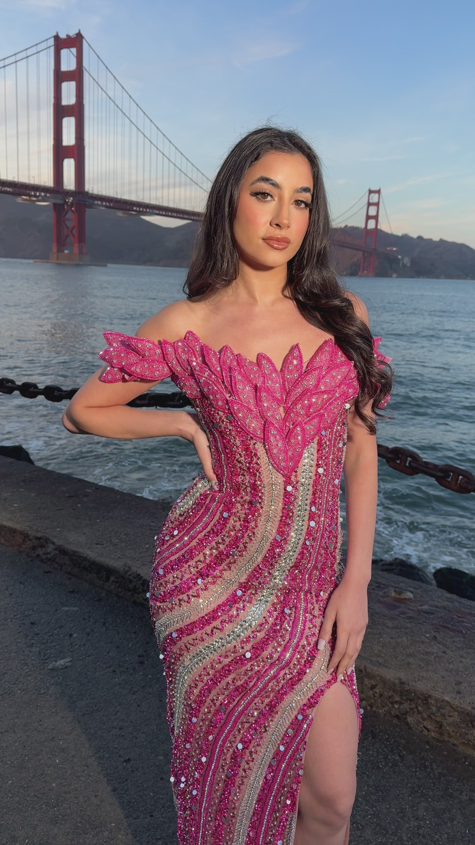 The Laila Off Shoulder Leaf Beaded Sequin Dress is a stunning one of a kind evening gown for the glamorous woman. This one-of-a-kind masterpiece is adorned with thousands of high-quality stones and beads, each meticulously hand-sewn to create a luxurious and enchanting visual spectacle that sets it apart from the ordinary.