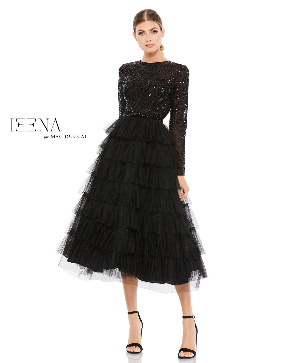 Mac Duggal 26299 Chic tea-length dress with a sequined bodice, long sleeves, and a round neckline. A-line skirt features black layered tulle, and hand-beaded belt accents the natural waist.