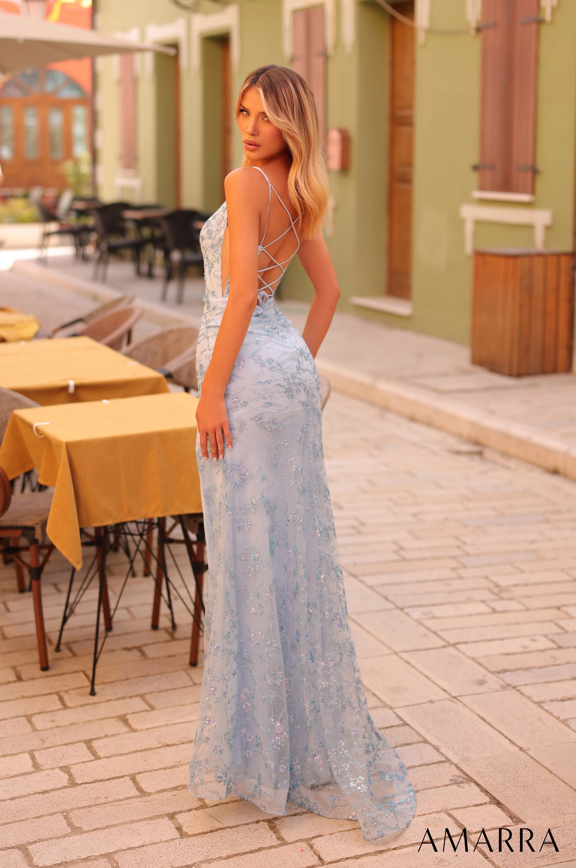 Regal gown made from tulle and satin, featuring a V-shaped neckline, subtle spaghetti straps, and a high slit.