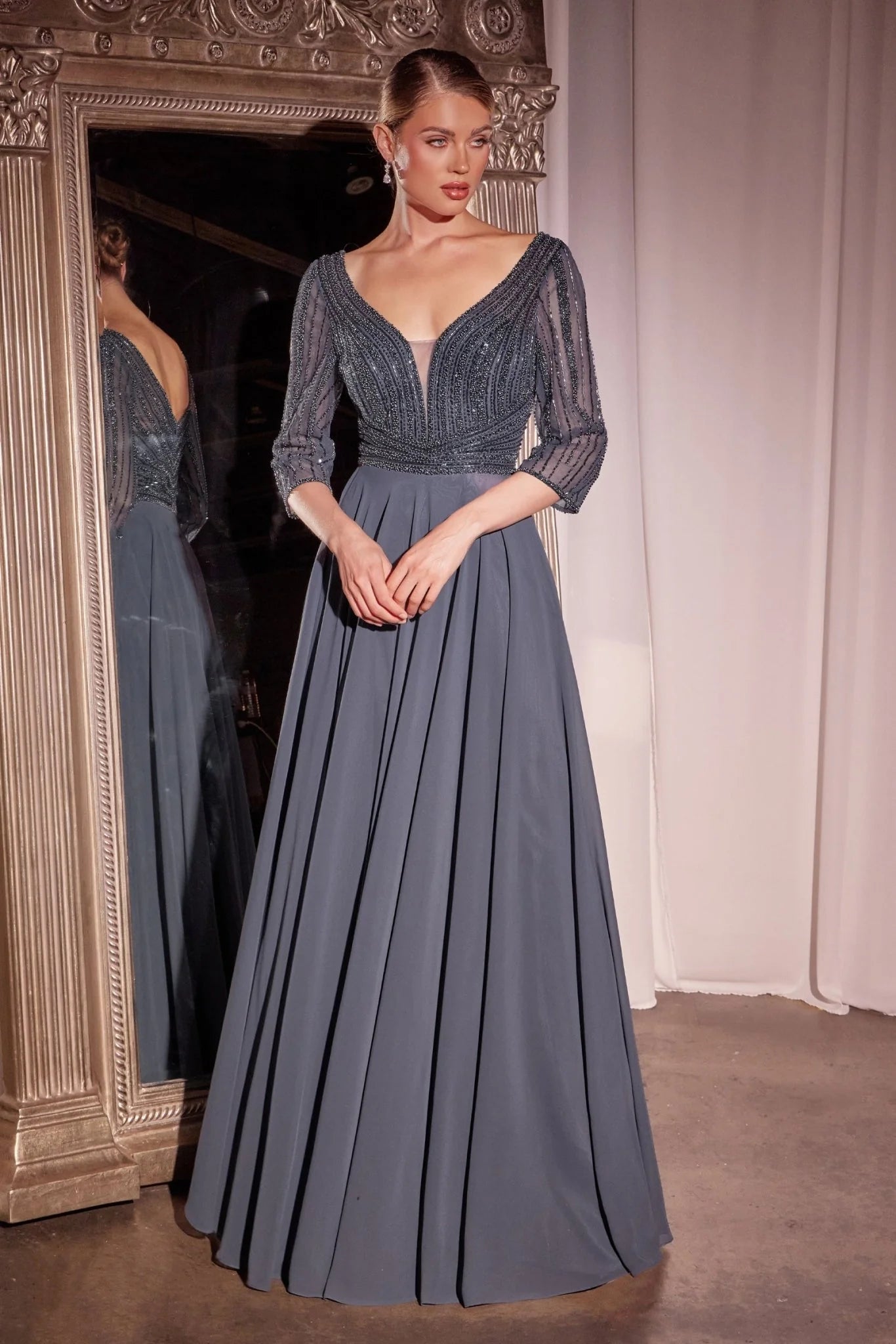 The Cinderella Divine CC446 epitomizes sophisticated grace with its A-line silhouette, deep V-neckline, and elegant long sleeves that create a refined, elongated frame. The intricately beaded bodice radiates understated glamour through its shimmering detailing, while the flowing chiffon skirt permits fluid, graceful movement. Expertly designed for mothers of the bride and formal occasions, this gown masterfully balances luminous embellishment with modest elegance, delivering a timeless presence that honors both beauty and restraint.