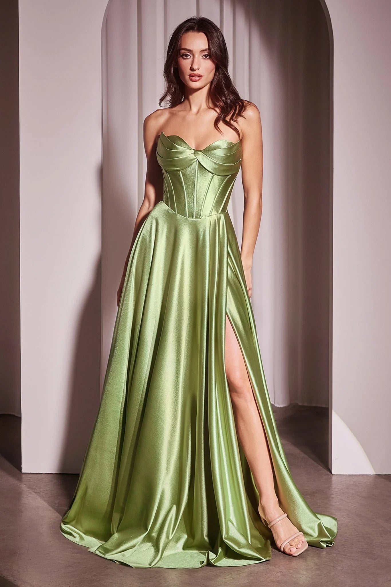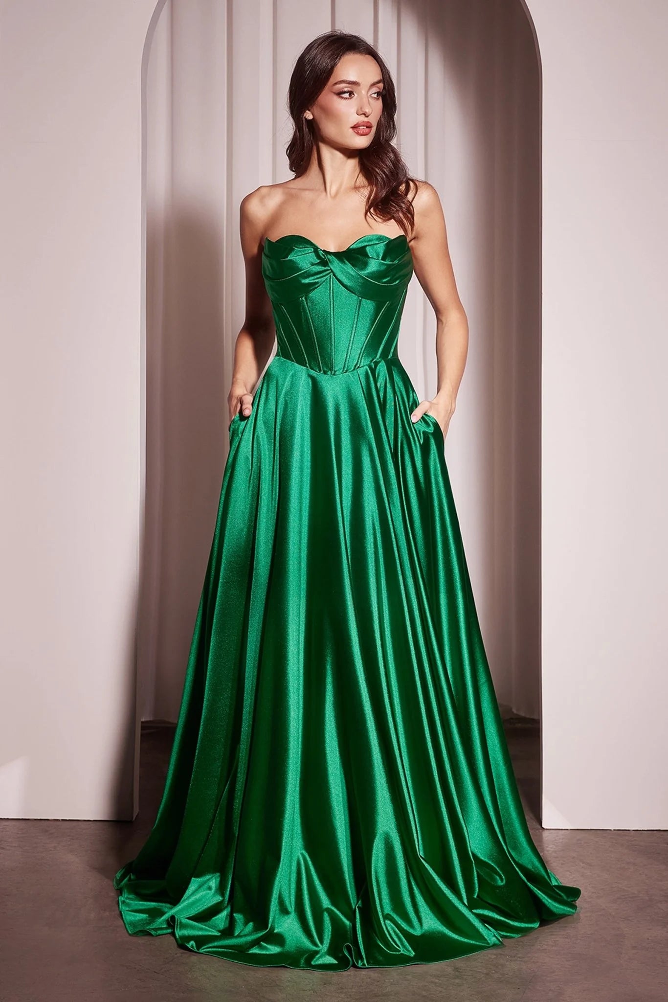 This stunning A-line gown features a strapless sweetheart neckline and a boned bodice, offering a supportive and flattering fit. Crafted from luxe satin, it boasts a full skirt with a leg slit and convenient pockets for an added touch of charm. Perfect for prom, weddings, or any formal occasion, this gown exudes effortless elegance and modern allure.
