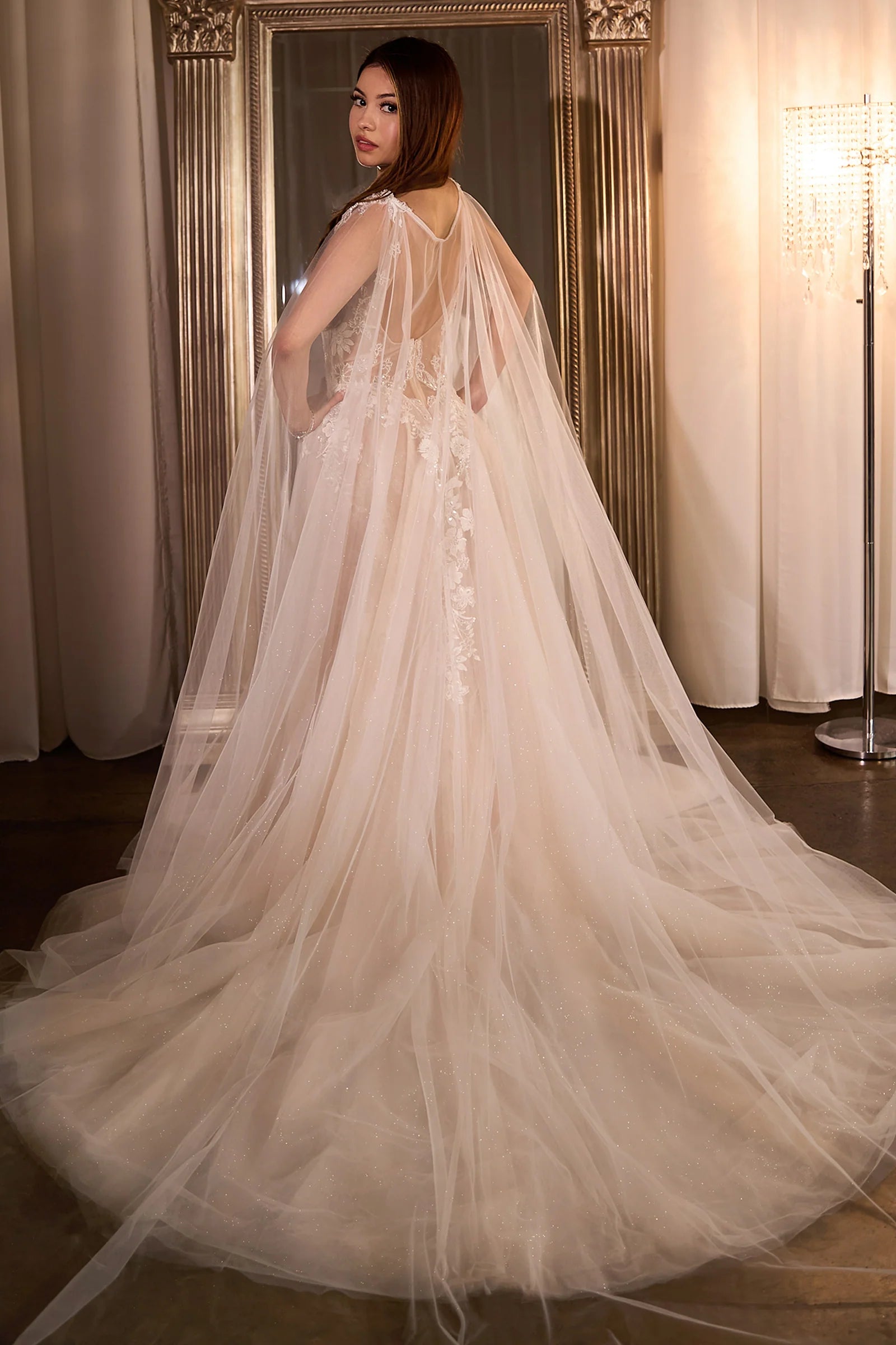 Enhance your elegance with Cinderella Divine CDS476W. This stunning gown features intricate beaded and embroidered details, flattering corset details, and a scoop illusion back. The sheer cape adds a touch of glamour, while the concealed zipper closure ensures a perfect fit. The court train adds a dramatic finish to this timeless piece.
