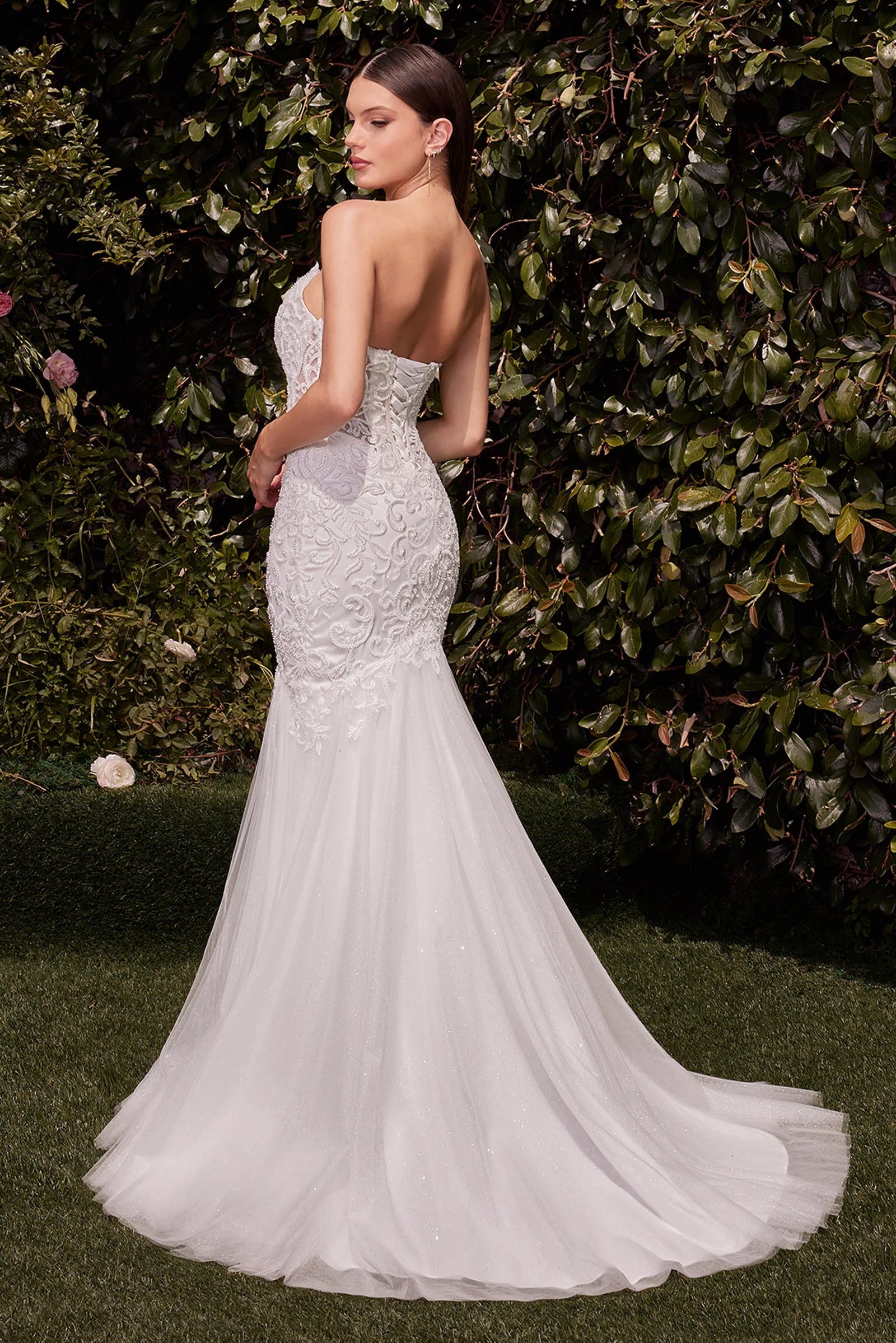 This stunning mermaid wedding gown features a strapless pointed neckline with intricate lace detailing and a delicate short train. The fitted, structured bodice with a lace-up corset back provides a perfect blend of support and elegance. Crafted from embellished lace appliqué and layered tulle, it's an ideal choice for a sophisticated bridal look.