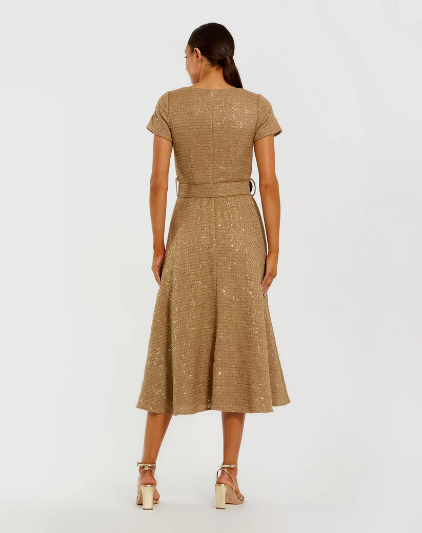 Elevate your wardrobe with this sophisticated gold boucle midi dress, a timeless piece that seamlessly transitions from day to evening. The high neckline and button-up front create a polished silhouette, while cap sleeves offer refined elegance without sacrificing comfort. Crafted from luxurious boucle fabric, this dress delivers subtle texture and dimension that catches the light beautifully. The midi length provides versatile styling options—pair with heels for formal occasions or dress down with flats for refined casual wear. A wardrobe essential that exudes understated luxury and enduring style.