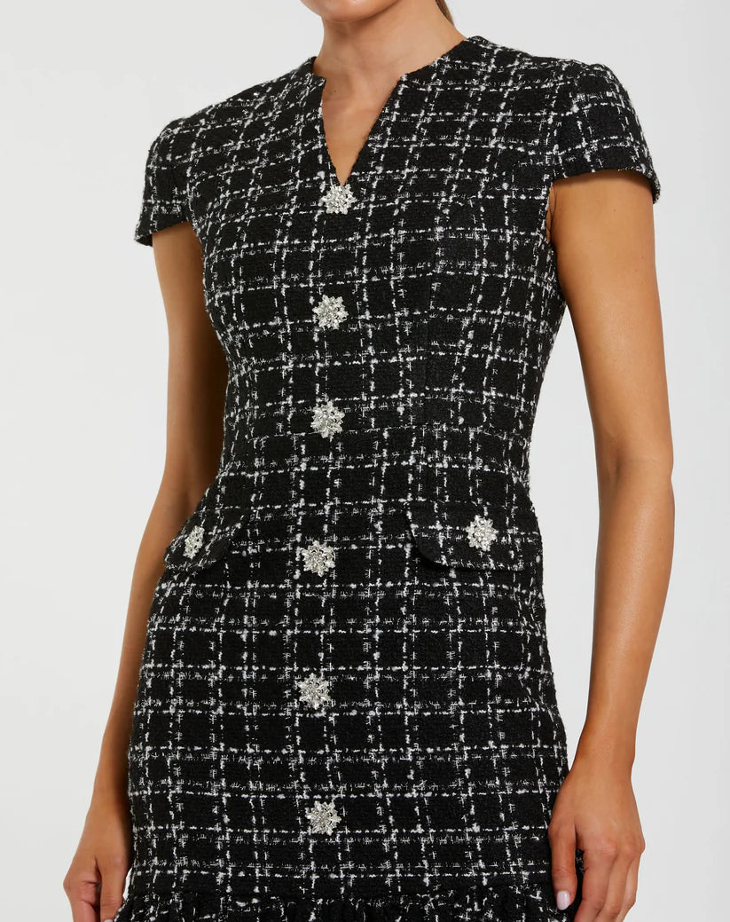 Elevate your wardrobe with the Mac Duggal 37071, a black cap sleeve boucle A-line midi dress designed for sophisticated style and comfort. The boucle fabric adds texture and depth, while the cap sleeves offer a refined silhouette. Its midi length and A-line cut provide a flattering fit that moves gracefully, perfect for occasions requiring understated elegance. This dress combines timeless design with expert tailoring to ensure both confidence and ease throughout your day or evening event.