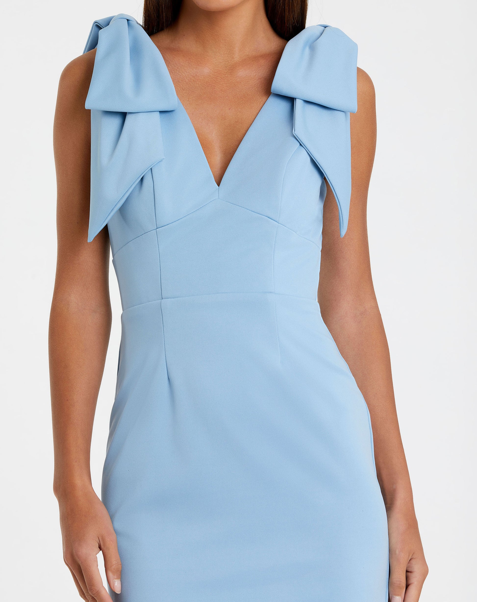The Mac Duggal 49954 midi-length evening dress is crafted from luxurious crepe fabric, offering a sleek, fitted silhouette that flatters the figure. Its elegant V-neckline and delicate bow straps add a refined touch, while the low V-back and center back slit enhance movement and sophistication. Perfect for formal occasions, this dress combines classic design with modern allure.