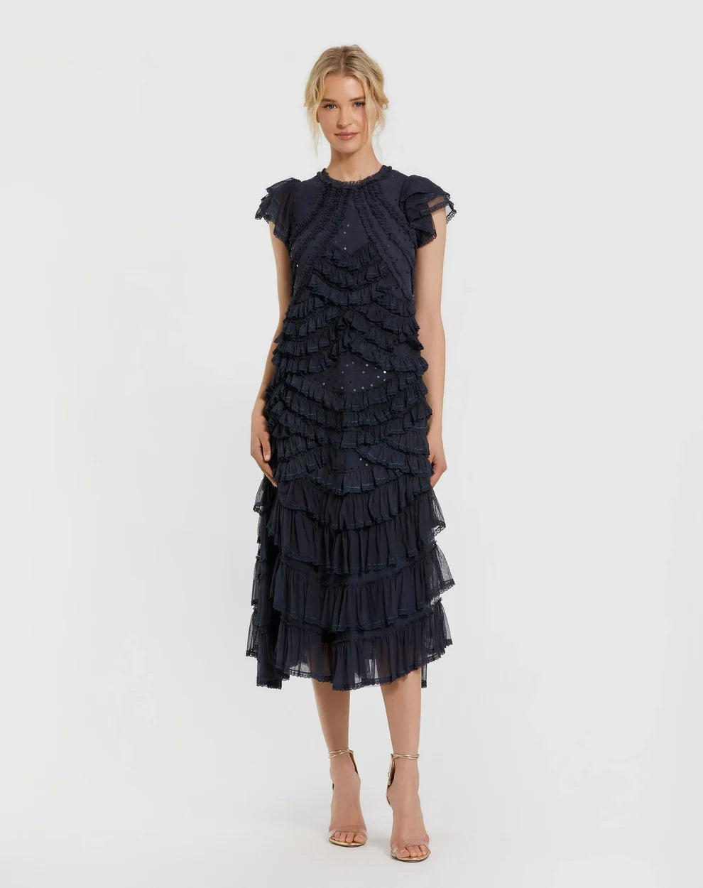 Elevate your evening wardrobe with the Mac Duggal 8371, a navy midi dress featuring a sophisticated high neck and delicate cap sleeves. The subtle micro ruffle detailing adds refined texture, while the flattering silhouette ensures an elegant fit. Perfect for formal occasions, this dress combines timeless style with contemporary design for a polished and graceful look.