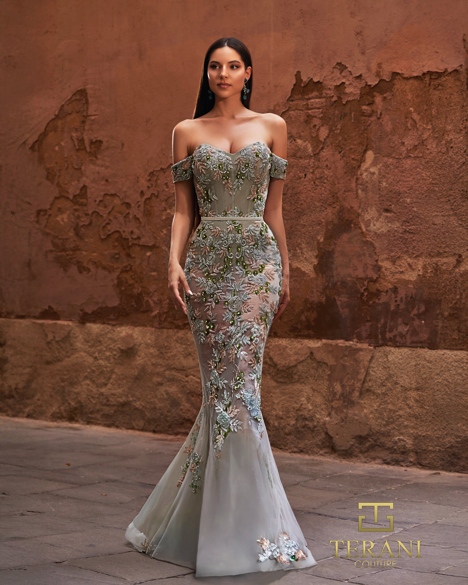 The Terani Couture 261P6676 Off-the-Shoulder Mermaid Gown in Sage epitomizes refined glamour with its expertly balanced design elements. Off-shoulder straps frame a sweetheart neckline, creating an alluring silhouette that draws the eye upward. Dimensional embroidery and delicate floral appliqués adorn the tulle, building visual interest from bodice to hem. An illusion bodysuit lining provides modern sophistication while maintaining timeless elegance. The mermaid silhouette hugs the figure gracefully before flaring at the hem, with a 46″ length from waist creating a dramatic, floor-sweeping finish. A secure center-back zipper with hook-and-eye closure completes this statement-making gown for unforgettable formal occasions.