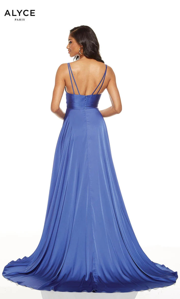 Alyce 1515 formal dress features a sculpted bodice with a shallow V-neckline, spaghetti straps and low back. This satin chiffon prom gown finishes in a faux wrap A-line skirt with a thigh-high overlap slit.