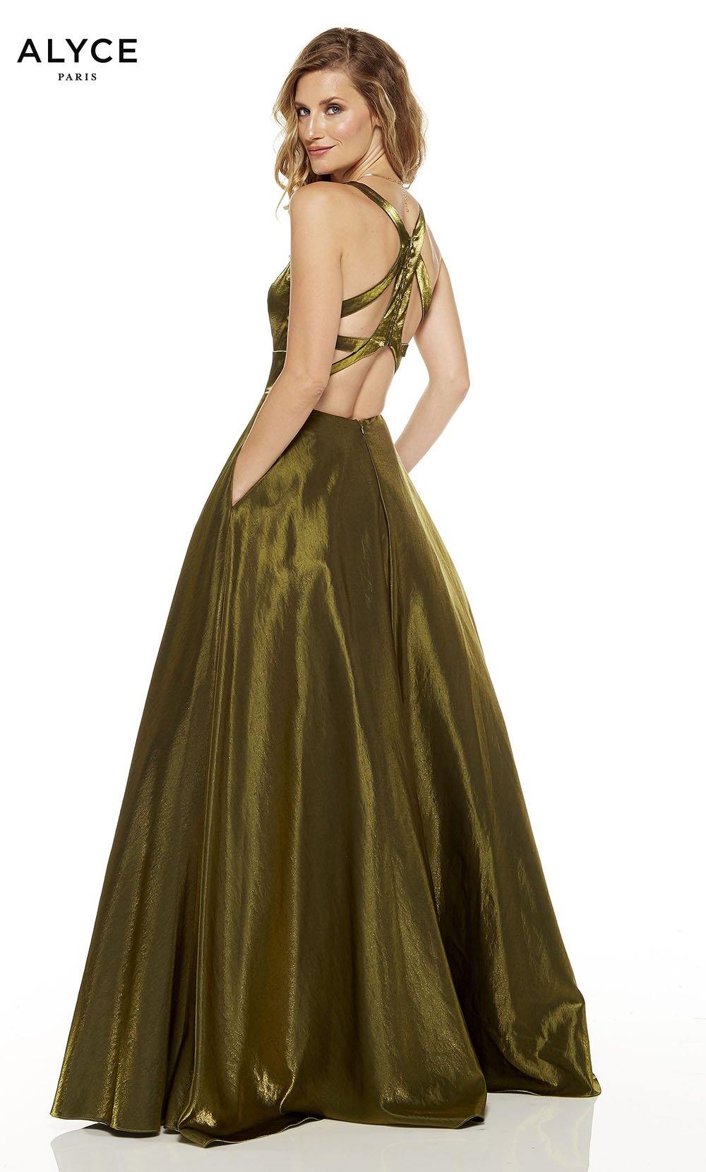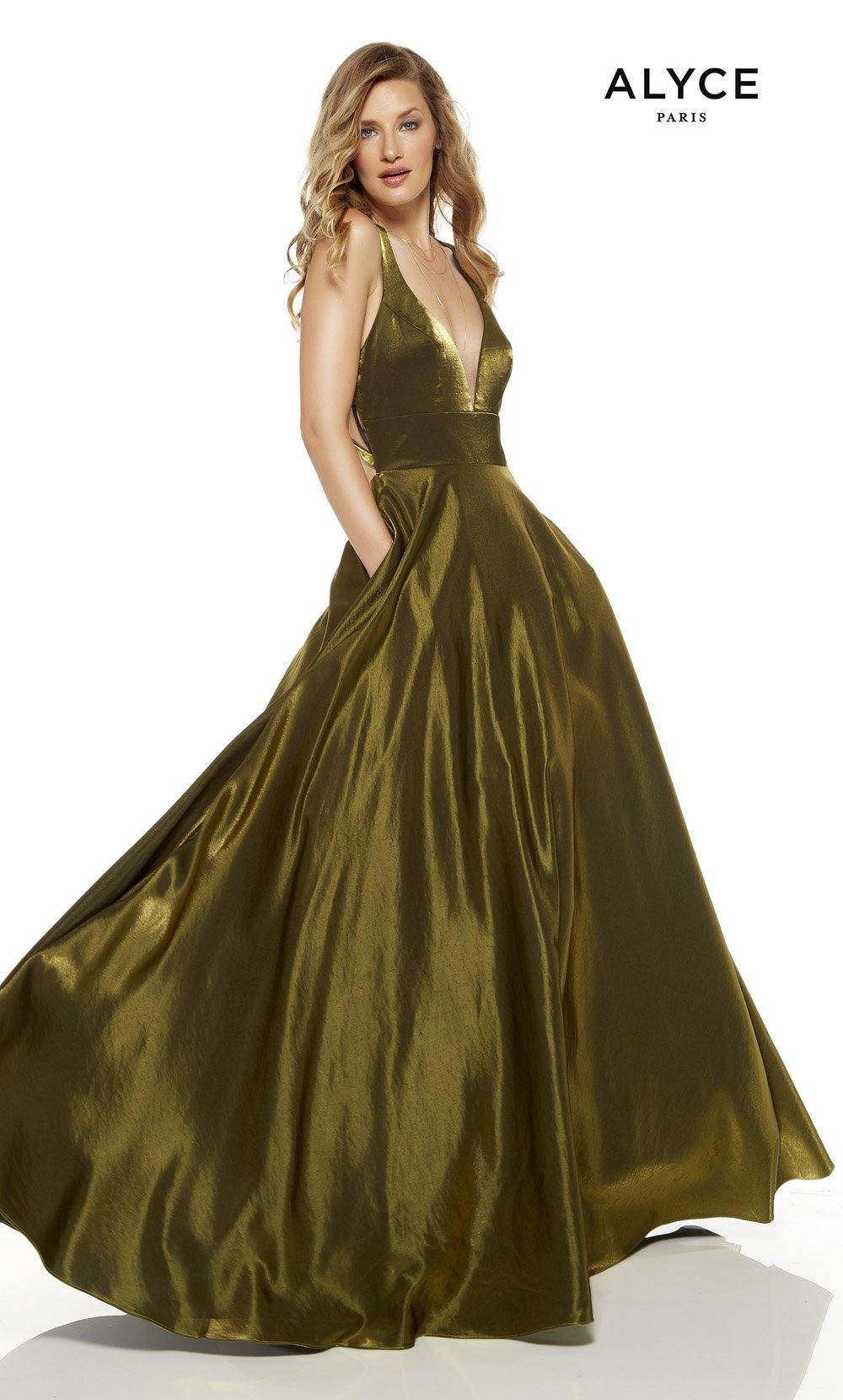 Alyce 1522 Long, Shimmer Satin, Plunging Neckline, Medium Fullness, Cutout Back, With Pockets.