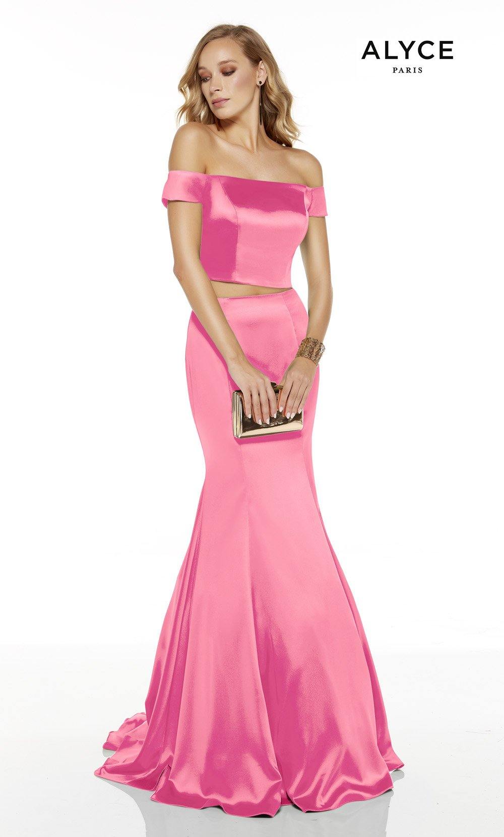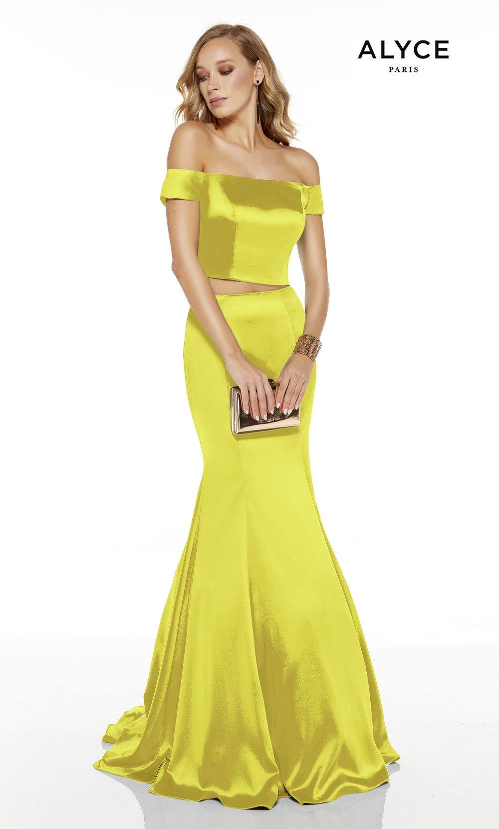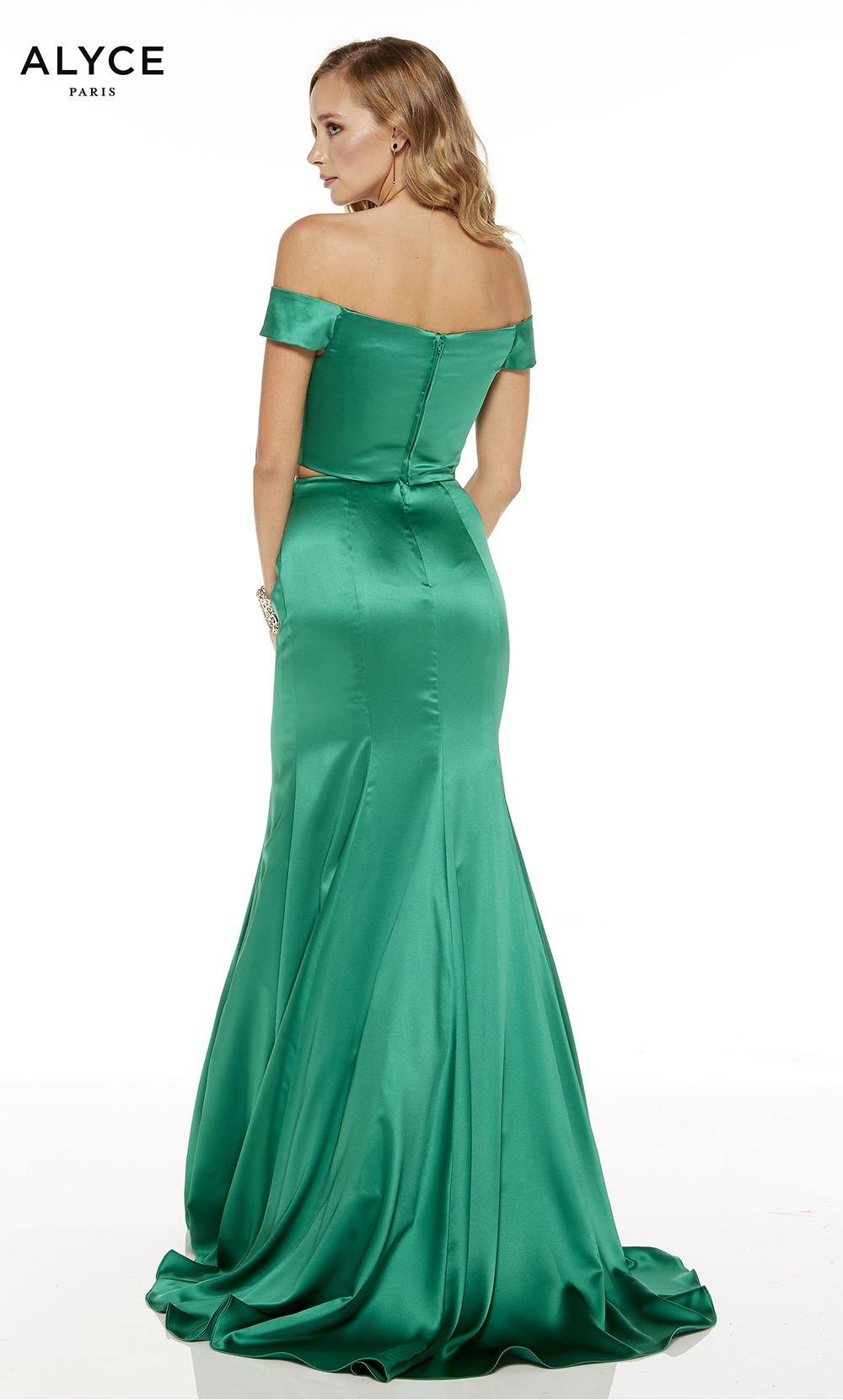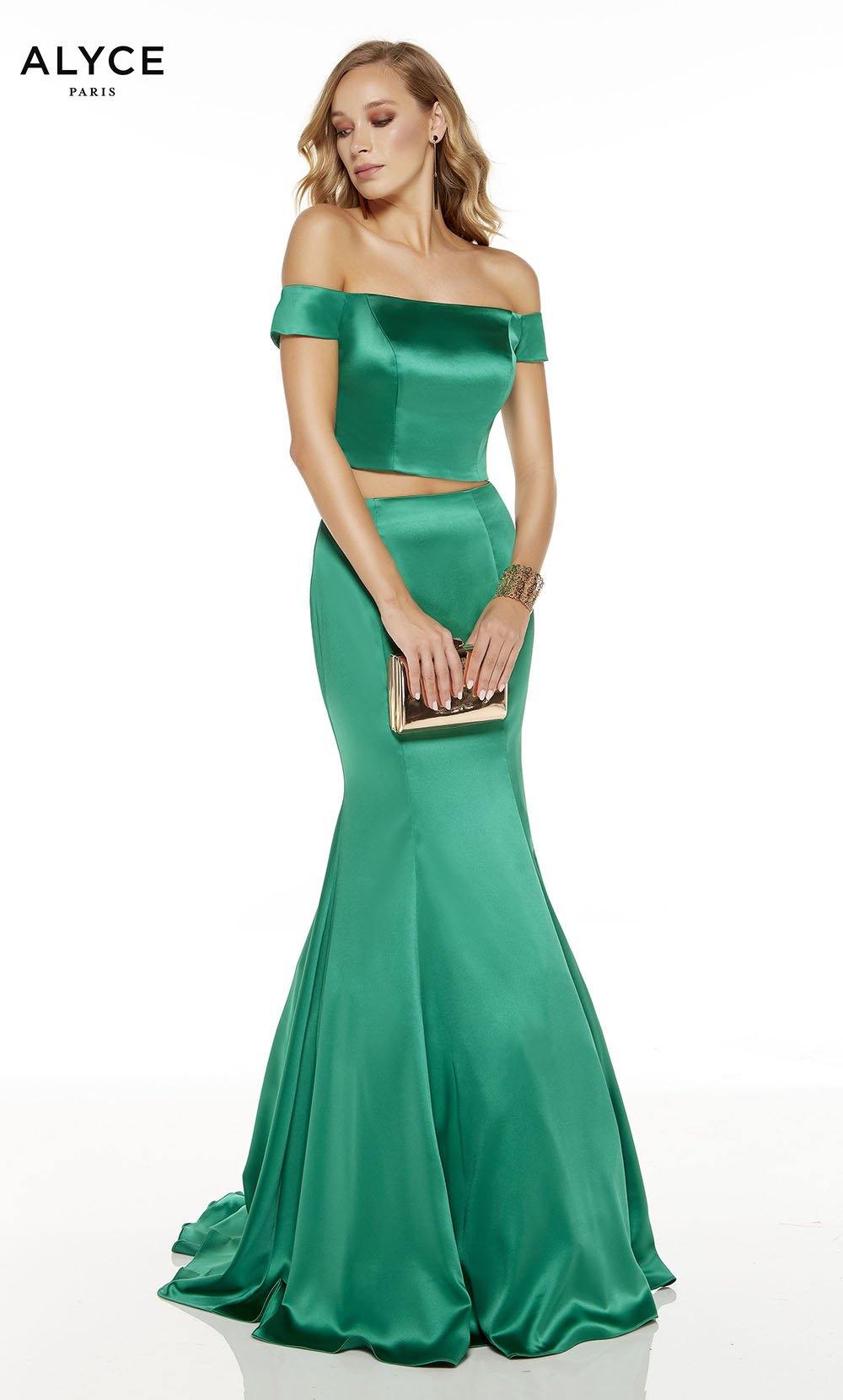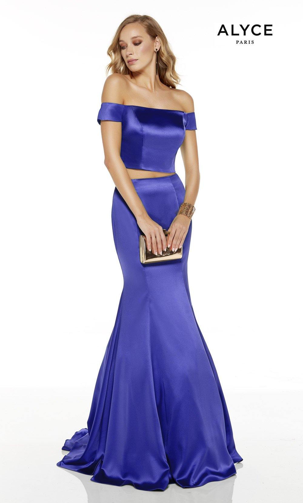 Alyce 1531 Long, Luminous Satin, Off The Shoulder, Mermaid, 2-Piece, Enclosed Back, Sweep Train.