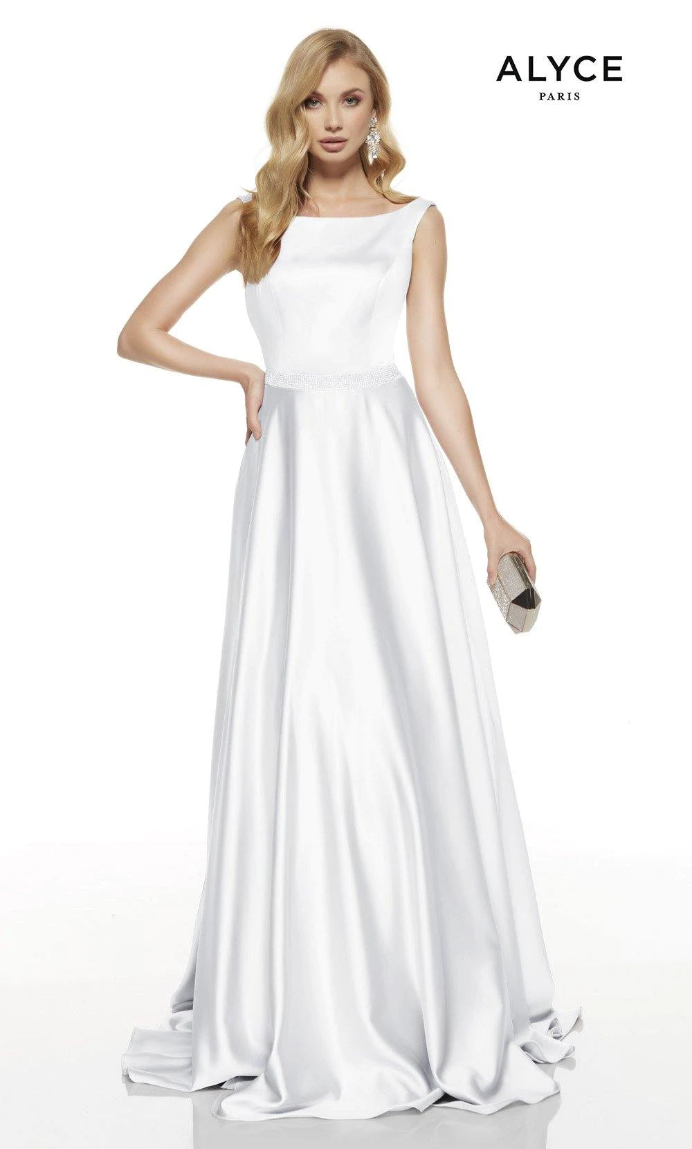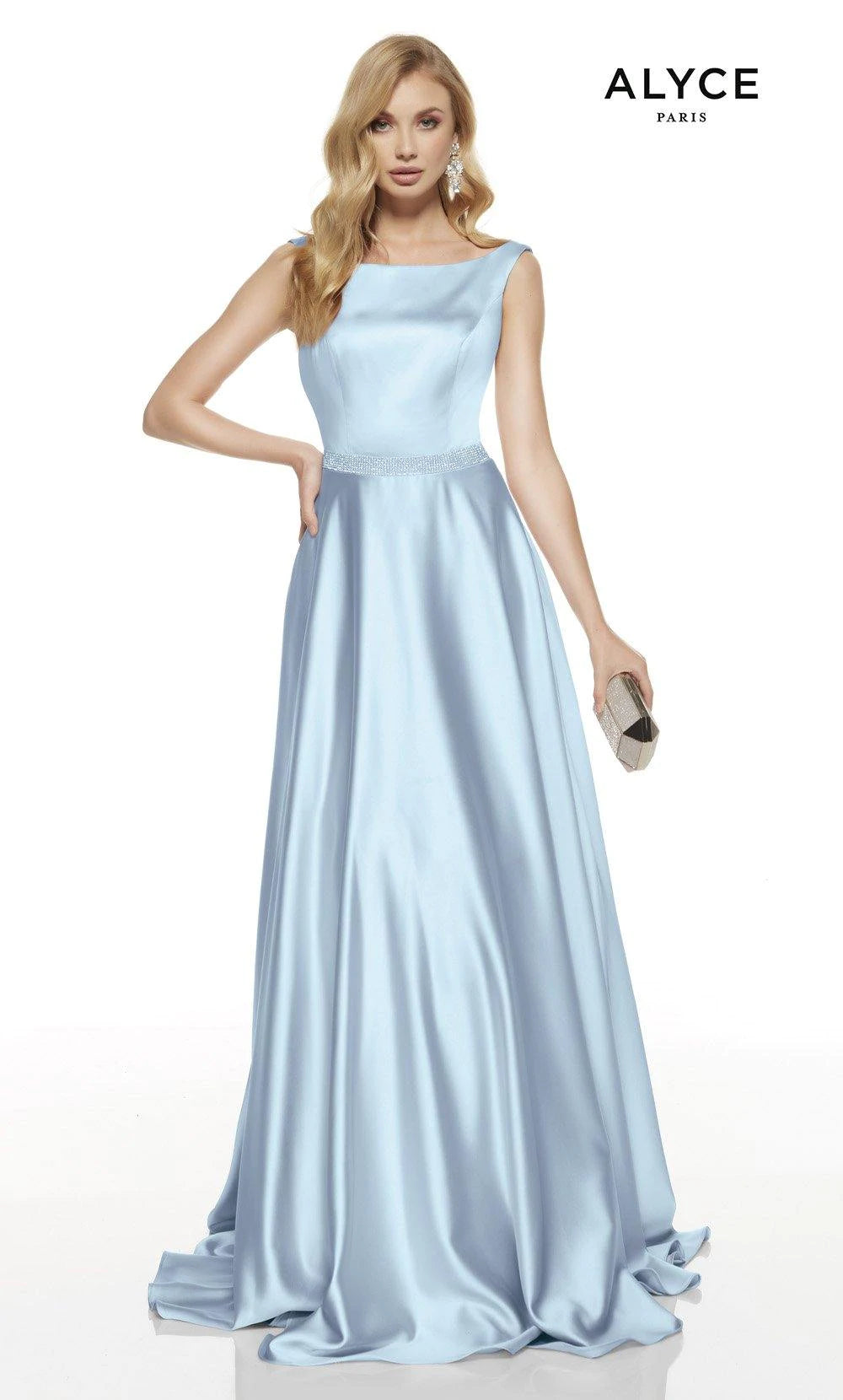 Alyce 1533 Long, Luminous Satin, Bateau Neckline, Medium Fullness, V Shaped Back, Rhinestone Belt.