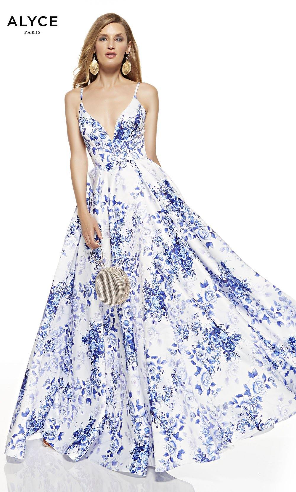 Alyce 1538 Long, Satin, Plunging Neckline, Medium Fullness, Strappy Back, Pockets.