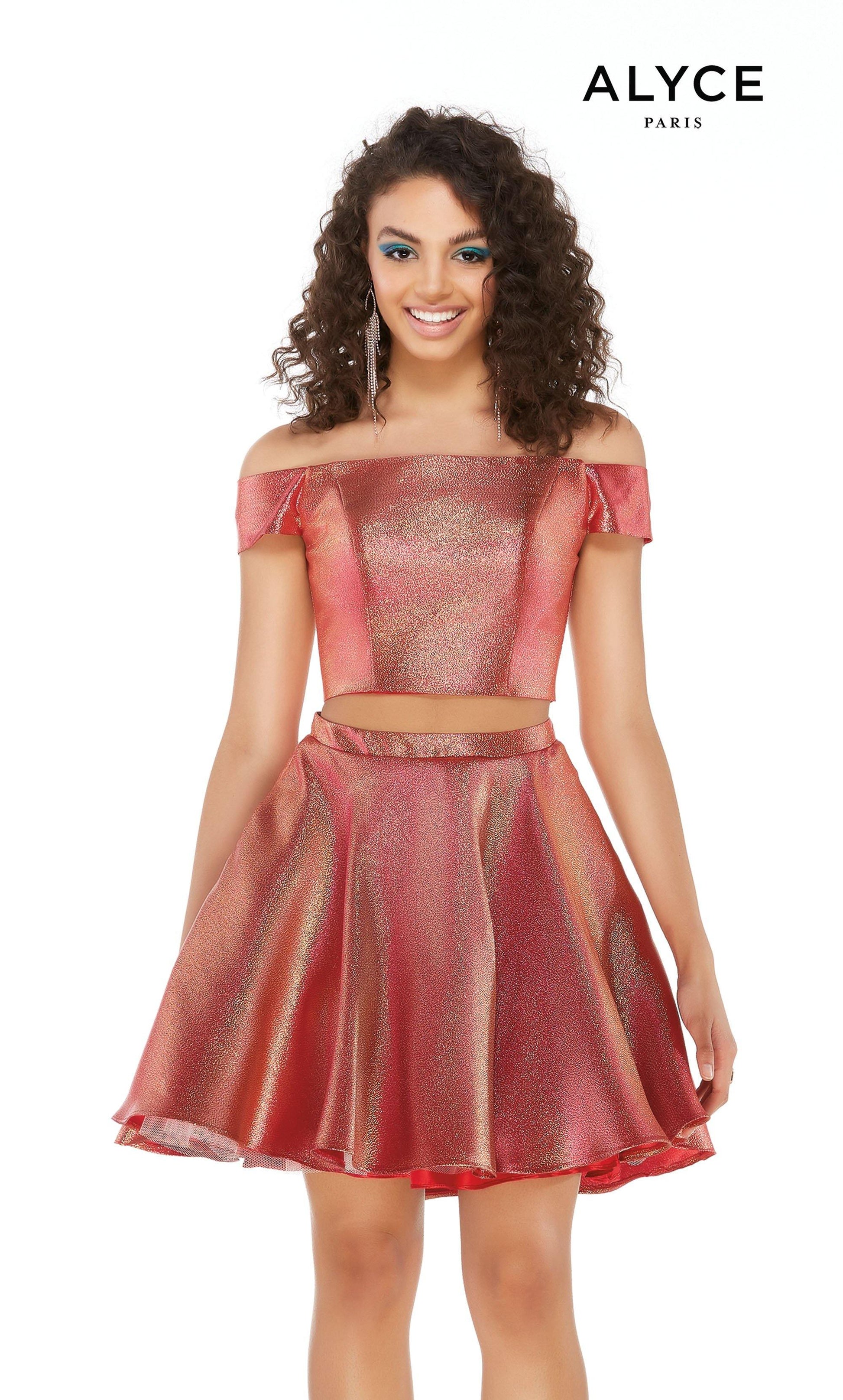 Alyce 1592 Short, Metallic Lame, Off The Shoulder, Fit N Flare, 2-Piece, Enclosed Back, Pockets.