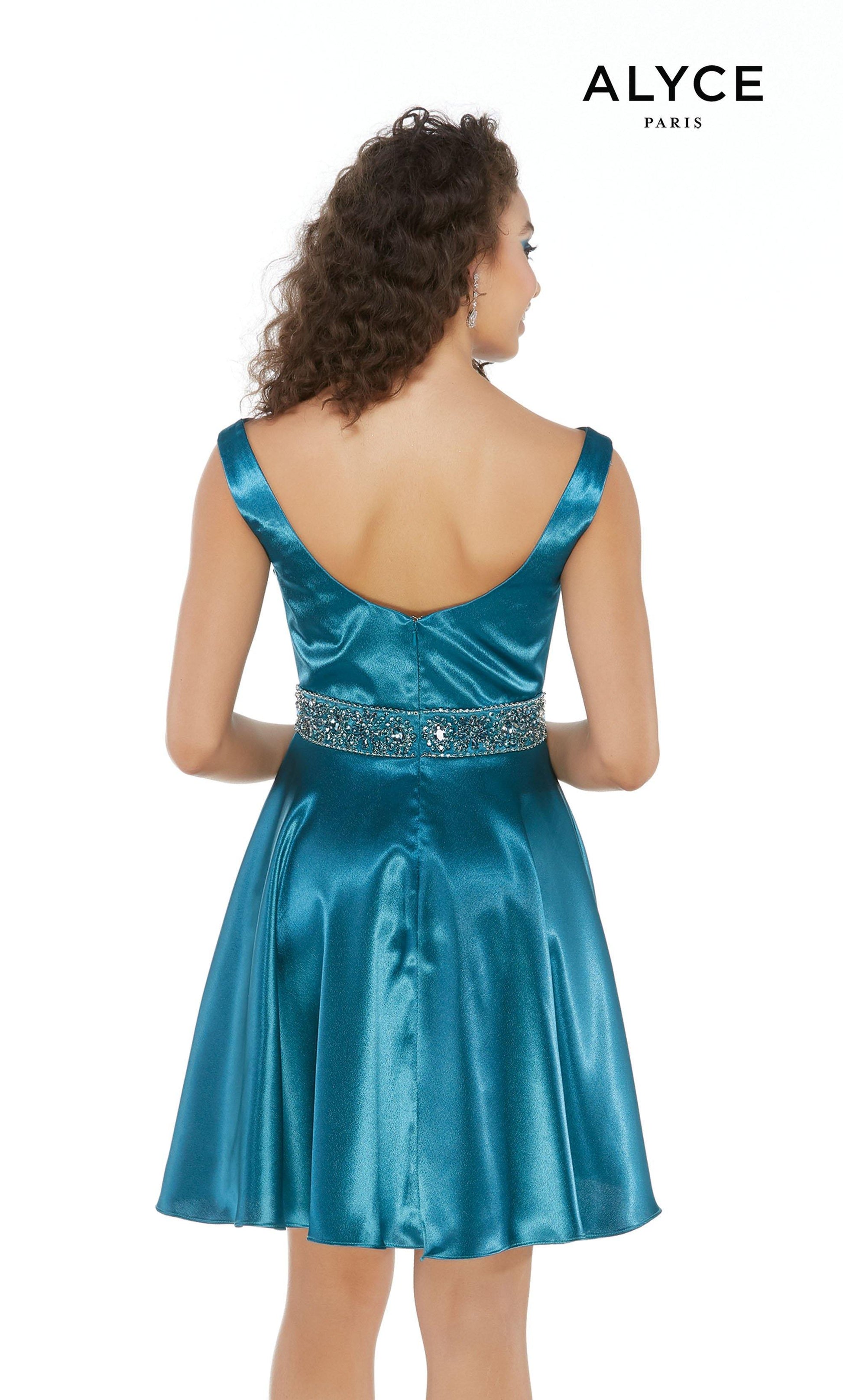 Alyce 1595 Short, Hammered Satin, Bateau, Fit N Flare, Enclosed Back, Embellished Waist, Pockets.