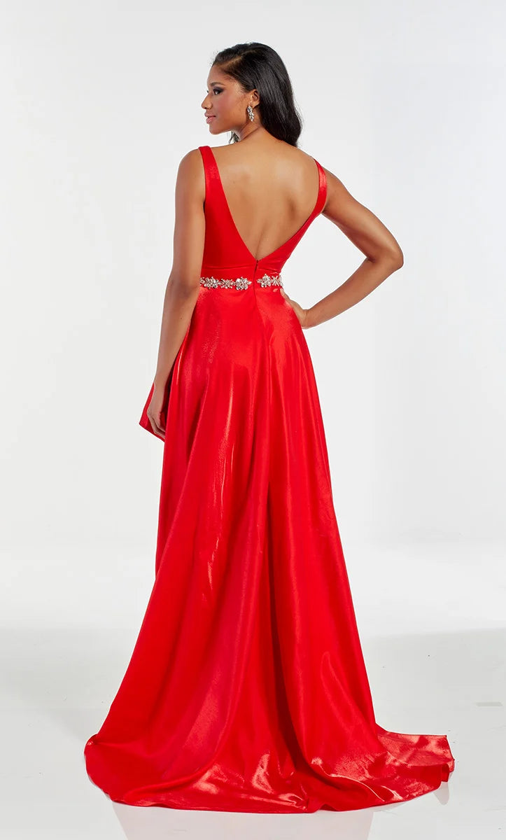 Alyce 1658 long dress features an A-line silhouette with a mesh insert plunging neckline, sheer side insets and an open V-back. Crystal beadwork around the waist lends glitz to this shimmer satin prom gown, finished with a cutaway slit and a court train.