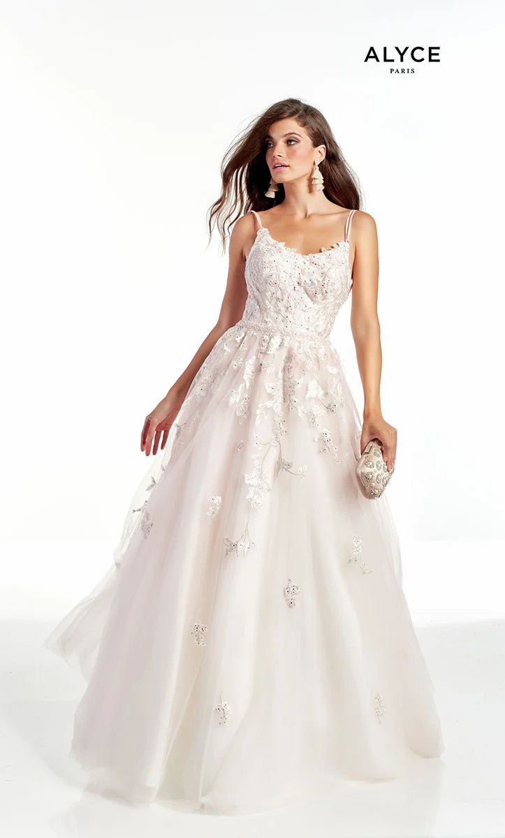 Alyce 60898 this prom dress is crafted in layers of tulle, with double spaghetti straps edging the shallow scoop neckline and V-back.