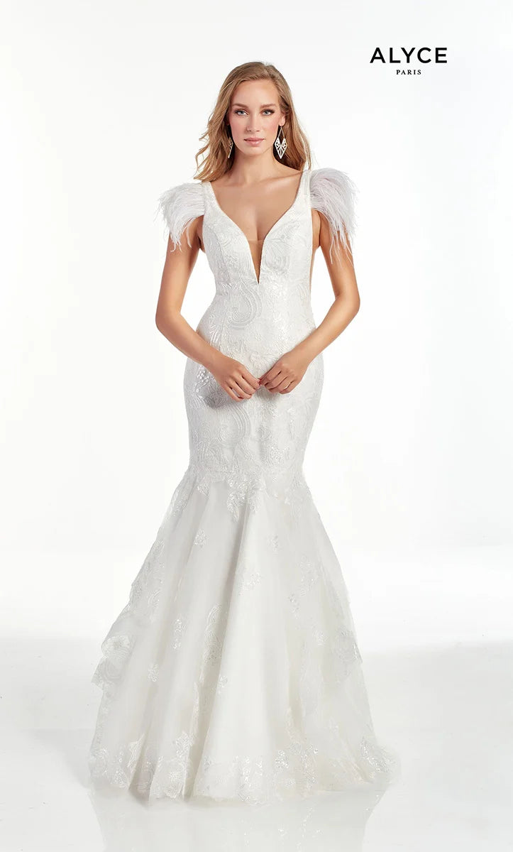 Alyce 60907 This dress features a trumpet silhouette with feather cap sleeves to frame the mesh insert plunging neckline and mid V-back. Beaded lace appliques embellish this form-fitting tulle gown, finished with plunging sheer sides and a side-tiered skirt.