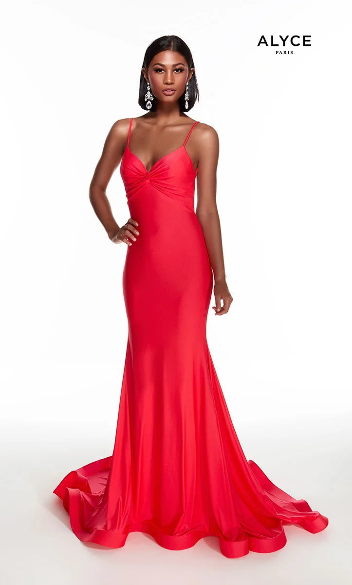 Alyce 60950 this slinky stretch gown brandishes a sleeveless bodice with ruched bust, V neckline and spaghetti straps. The skirt showcases a mermaid silhouette which cascades to a full-length hemline, completed with a sweep train.