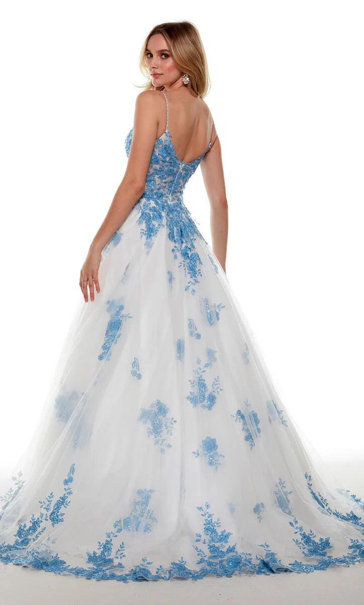 Alyce 61008 This dress has corset bodice and tulle skirt with floral appliques hug you comfortably. The best aspect of this gown is the skirt ending covered in sequin floral work, enhancing its grace.