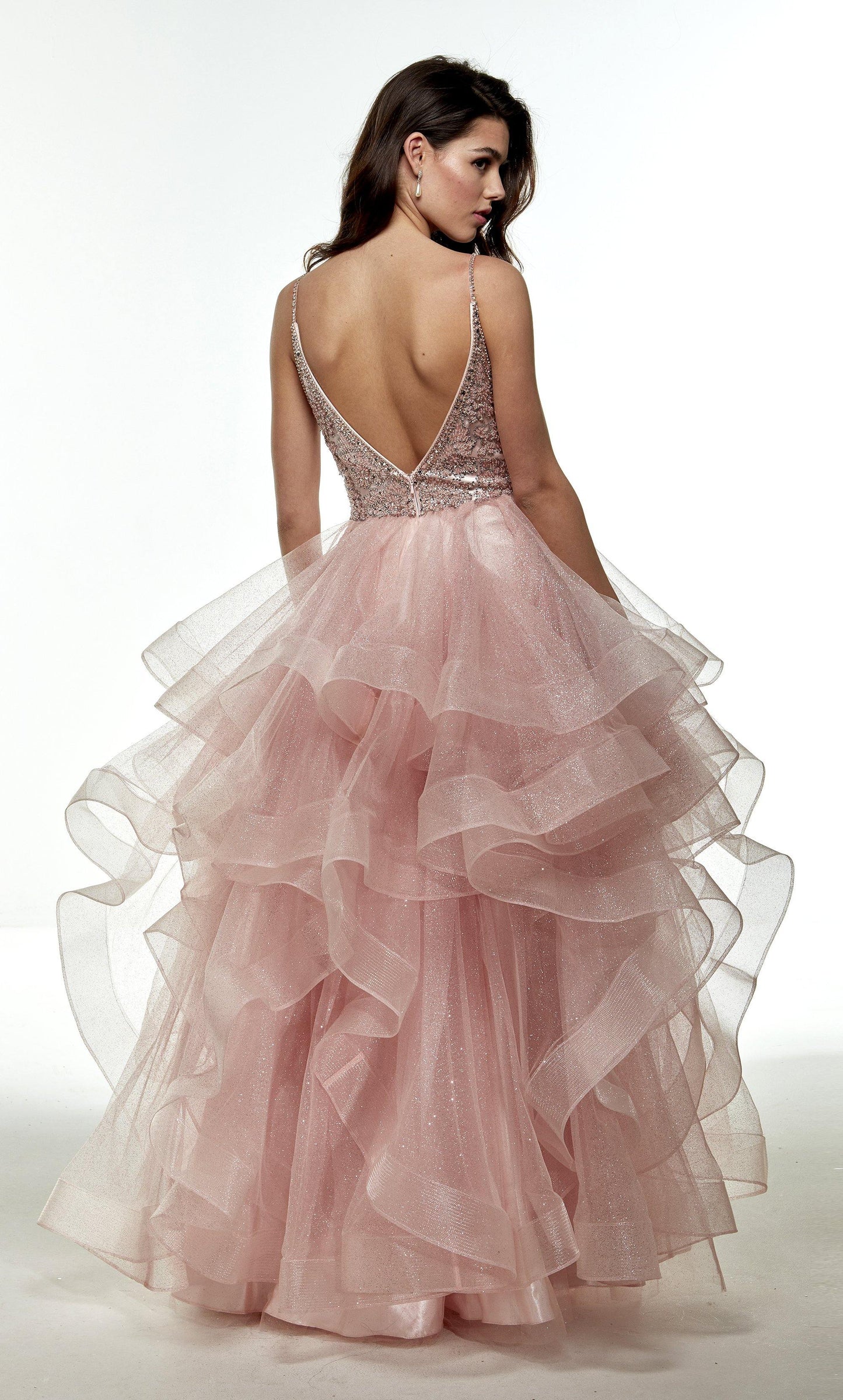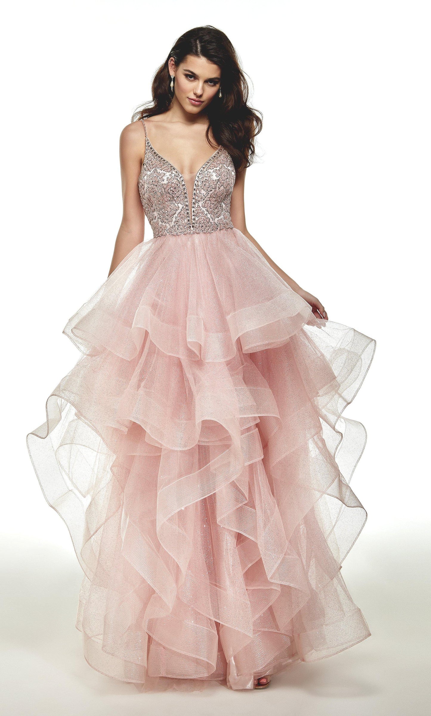 Alyce 61021 Long Pretty Dresses, Glitter Tulle, Plunging Neckline, Ball Gown, V Back, Beaded Bodice.