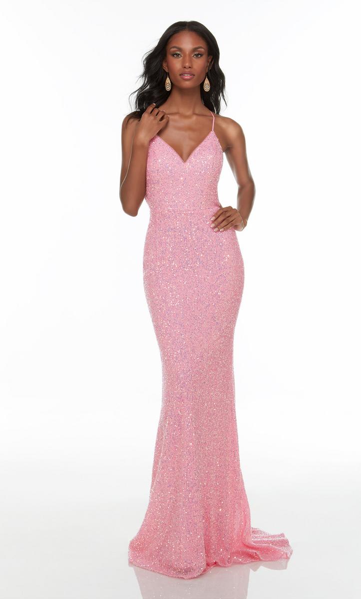 Alyce 61146 Long Elegant Dress, Sequins, V-neck, Straight, Strappy Back.